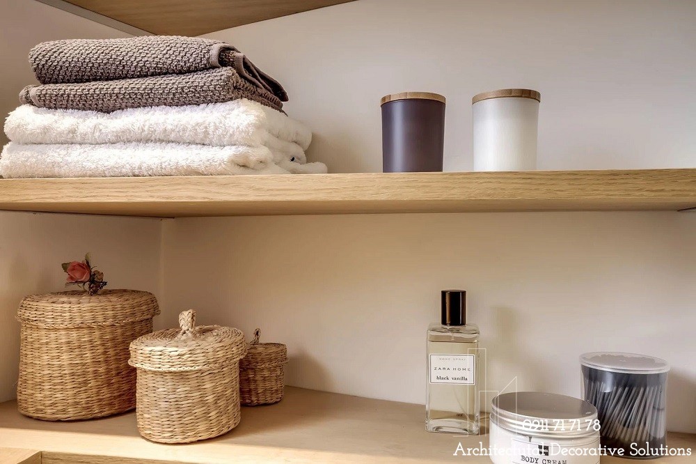 Các kệ nằm trong cùng sử dụng gỗ sồi như phòng bếp để đảm bảo tính đồng nhất.