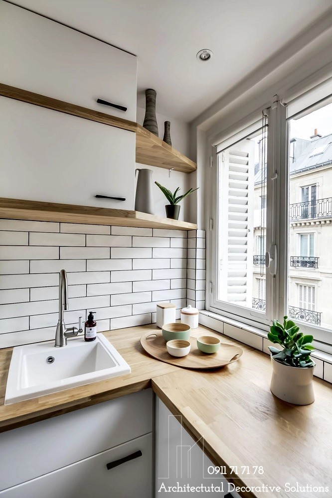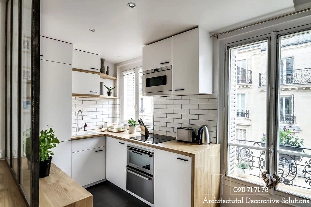 Nhà bếp mở thẳng ra phòng khách cho căn hộ kiểu Paris này.
