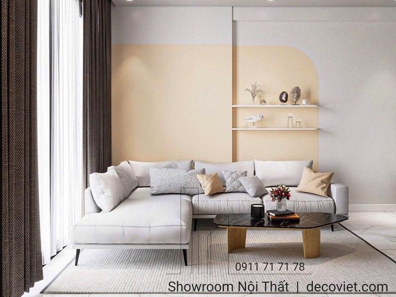 Với diện tích phổ biến 60–90m², sofa góc nhỏ gọn giúp tối ưu không gian mà vẫn đủ chỗ ngồi cho 3–5 người. Thiết kế chữ L cũng giúp phòng khách thoáng hơn so với sofa băng trong các bố cục có góc tường.