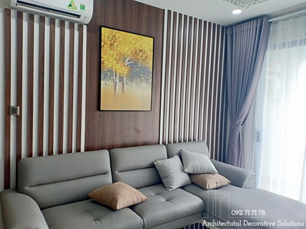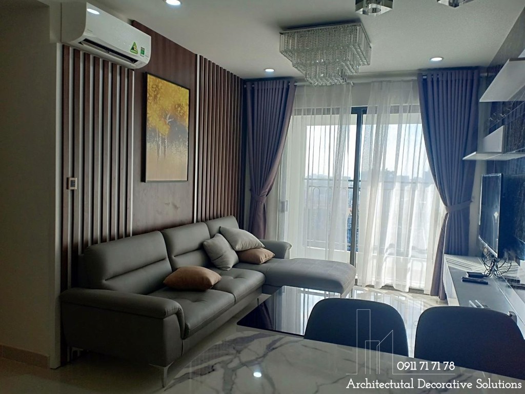 Thi công nội thất căn hộ 2PN Masteri An Phú quận 2ủ là sự kết hợp hài hòa giữa bộ ghế sofa góc màu xám trắng và mảng tường lớn được ốp gỗ sang trọng, bắt mắt.