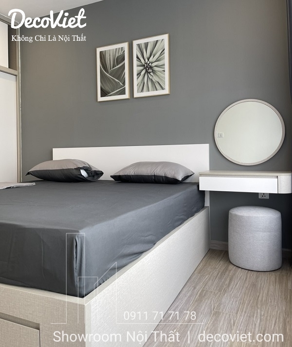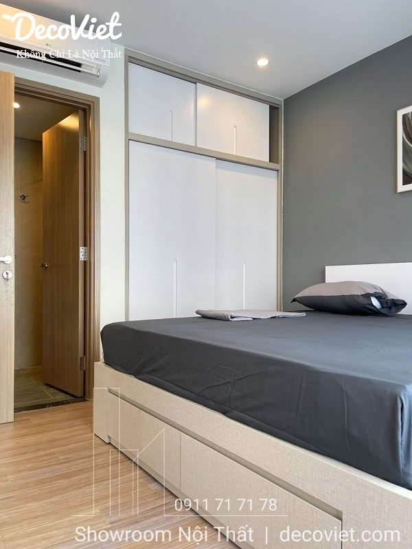 Nội thất phòng ngủ được bố trí mộ cách khoa học, gọn gàng với các món đồ nội thất cơ bản như giường ngủ hiện đại, tủ quần áo gỗ công nghiệp, bàn trang điểm gỗ nhỏ gọn. Điều này giúp giảm cảm giác chật chội khó chịu cho việc nghỉ ngơi thư giãn của bạn.
