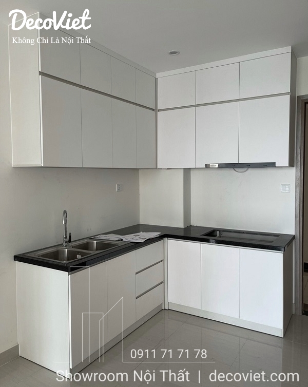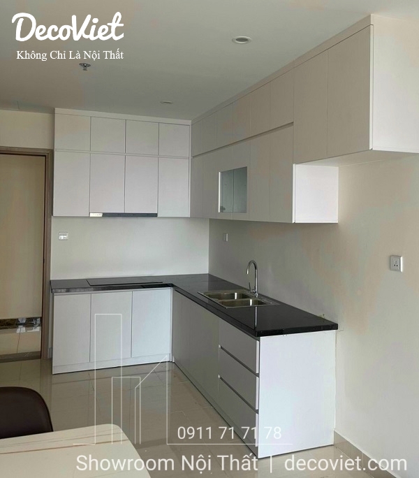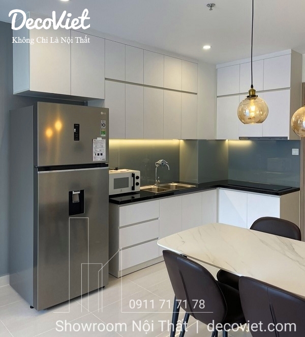 Trong căn hộ Winhome này, DecoViet đã sử dụng lối thiết kế liên thông giữa phòng bếpg với phòng khách, giúp không gian sinh hoạt thoáng mát, rộng rãi hơn. Thiết kế thi công tủ bếp gỗ công nghiệp gọn gàng, hợp xu hướng mới có nhiều không gian lưu trữ giúp thuận tiện trong việc cất trữ đồ đạc, giúp phòng bếp sạch và ngăn nắp.
