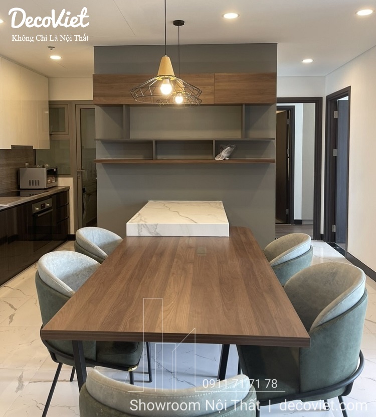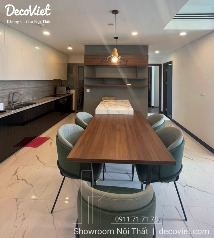 Trong căn hộ chung cư này, DecoViet đã sử dụng lối thiết kế không gian mở giữa phòng bếpg với phòng khách, giúp không gian sinh hoạt thoáng mát, rộng rãi hơn. Thiết kế thi công tủ bếp gỗ công nghiệp gọn gàng, hợp xu hướng mới có nhiều không gian lưu trữ giúp thuận tiện trong việc cất trữ đồ đạc, giúp phòng bếp sạch và ngăn nắp.