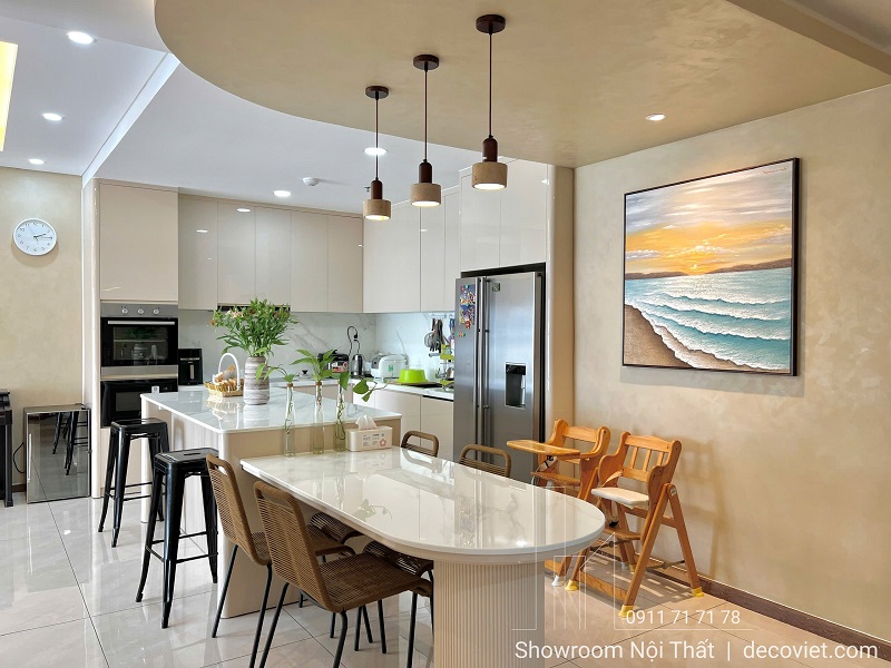 Trong quá trình thi công hoàn thiện nội thất phòng bếp, Nhà Decor luôn chú trọng cả công năng lẫn thẩm mỹ. Bàn ăn kết hợp đảo bếp với mặt đá sang trọng sáng bóng, ghế mây – ghế bar thanh lịch và ánh sáng vàng ấm tạo nên bầu không khí ấm cúng cho những bữa cơm gia đình.