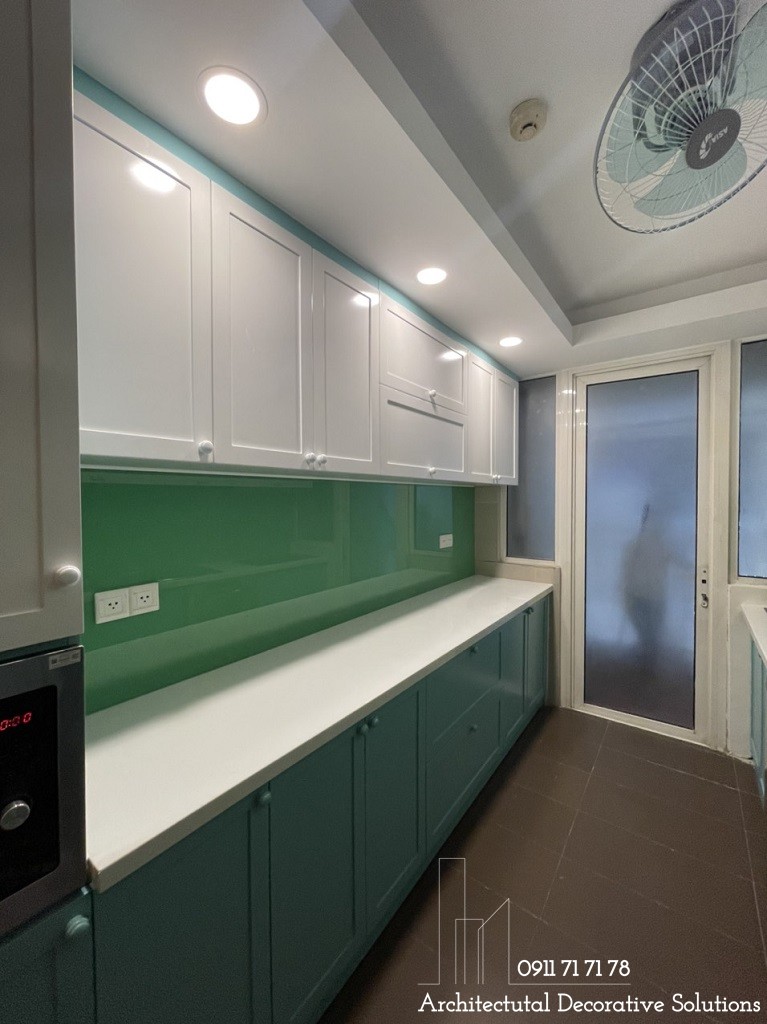 Một màu xanh tươi mát làm tấm ốp tường trong thiết kế tủ bếp này vô cùng hiện đại, tươi sáng.