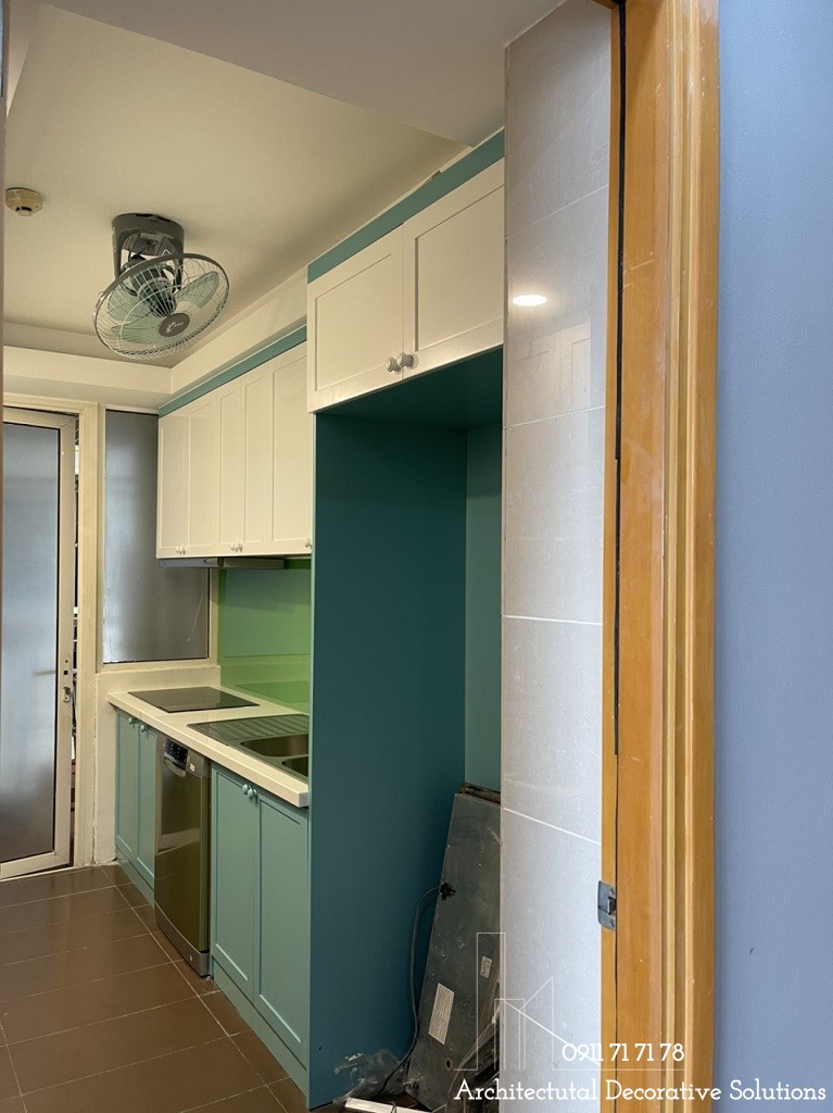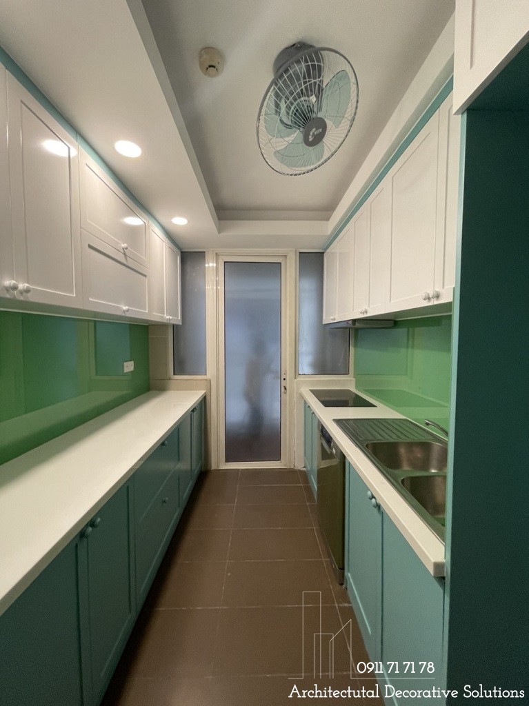 Màu xanh nhẹ nhàng khiến cho phòng bếp trở nên ấm cúng và khiến cho mọi thành viên cảm thấy thoải mái mỗi khi bước chân vào bếp.