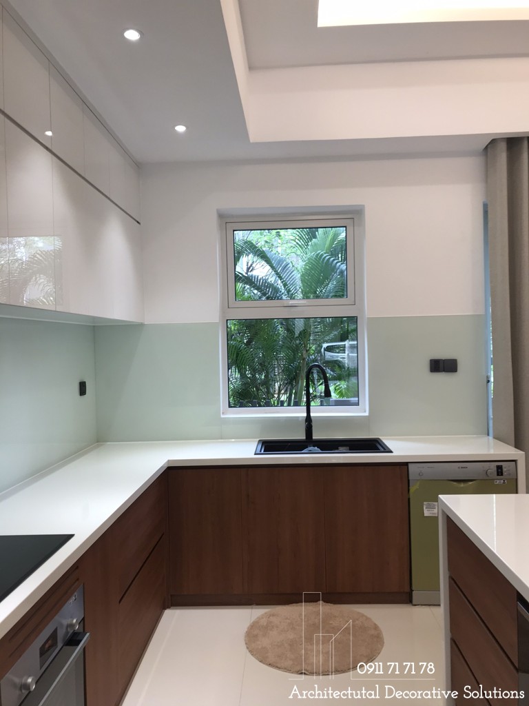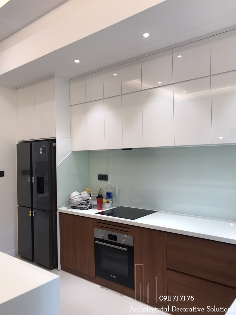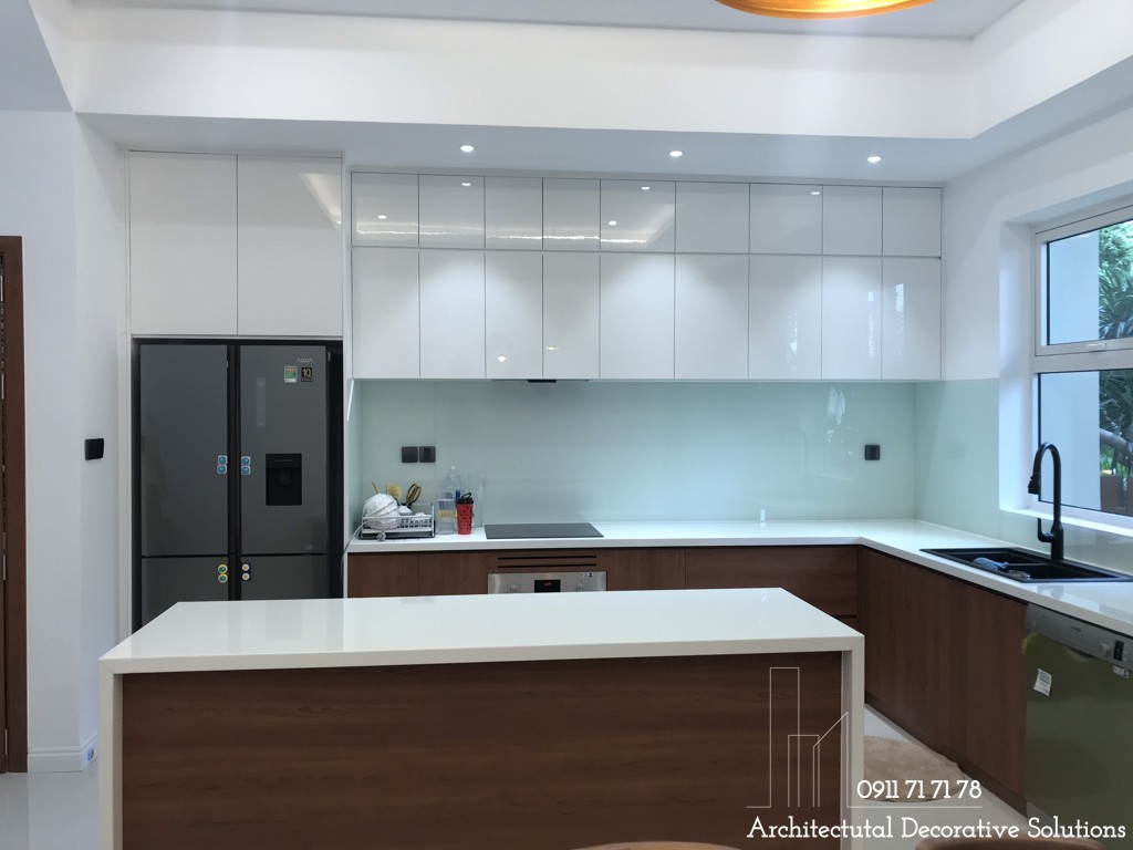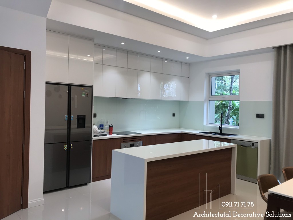 Khu vực bếp được thiết kế hiện đại. Điểm nhấn là bếp trên được kéo tới đụng trần cho chủ nhân thêm diện tích sử dụng và tạo chiều sâu hơn.