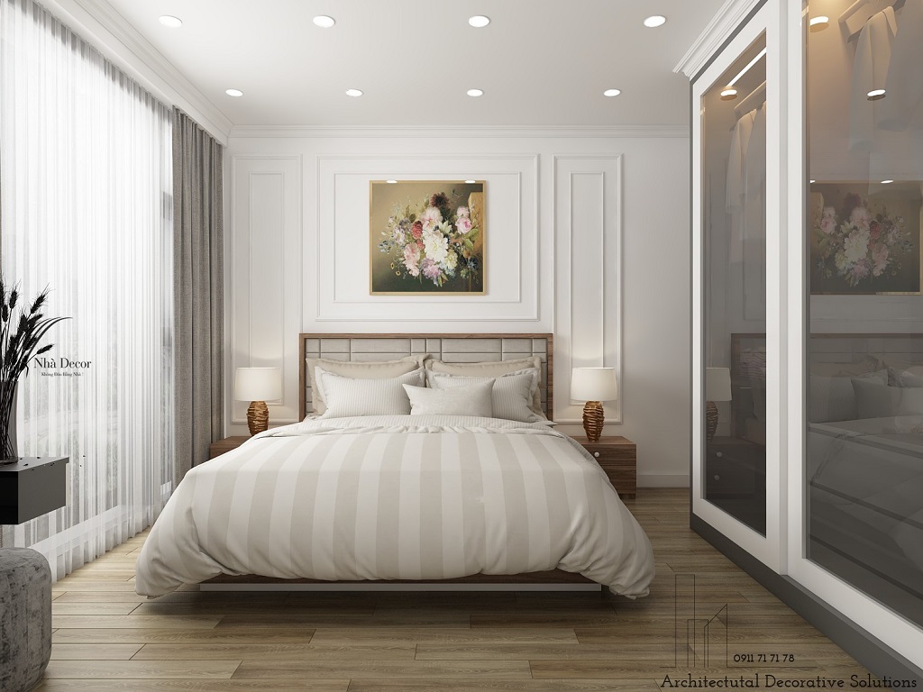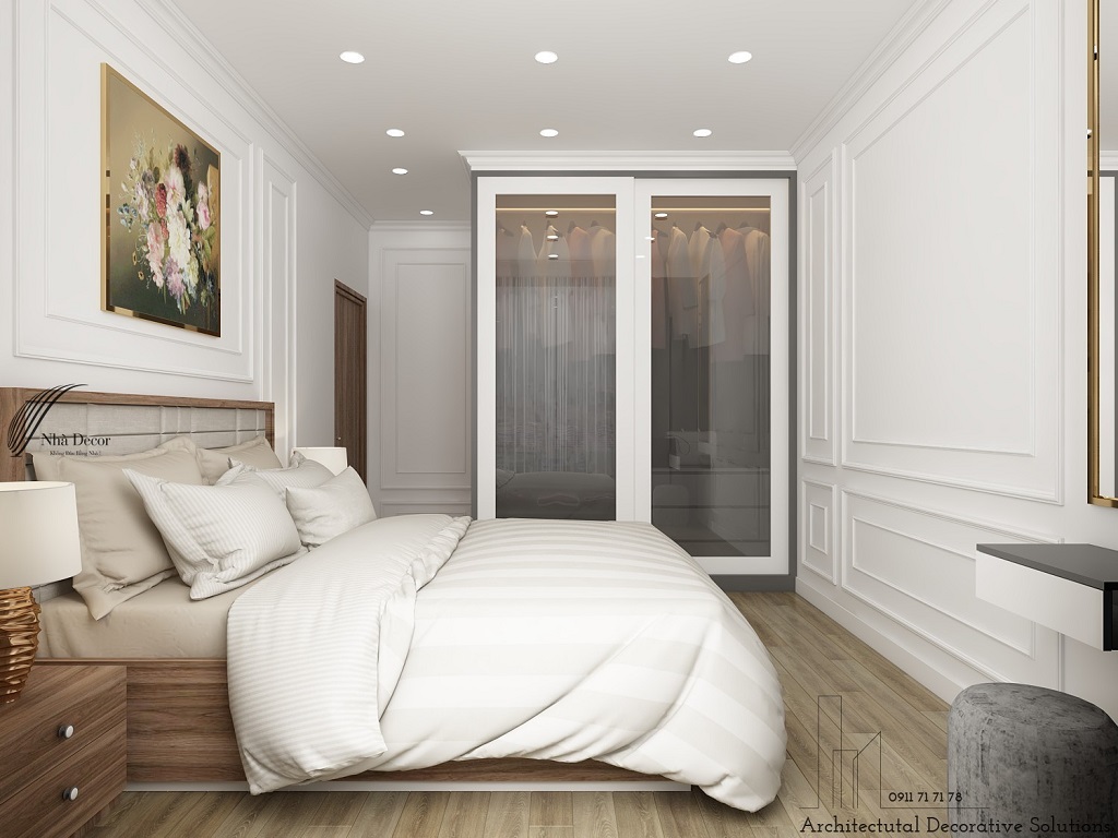 Các đồ nội thất phòng ngủ đều có thiết kế đơn giản, màu sắc trắng giúp cho không gian toàn bộ phòng ngủ rộng rãi và thoáng mát hơn.