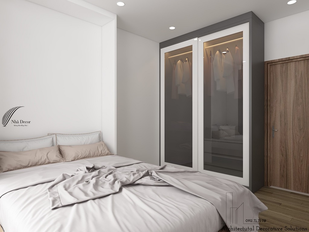 Tủ quần áo thiết kế cửa kính độc đáo tăng thêm phần sang trọng cho căn phòng. Các đồ vật được bày trí hợp lý là điểm nhất của phòng ngủ. Giúp cho ngôi nhà tiện nghi và tinh tế hơn.