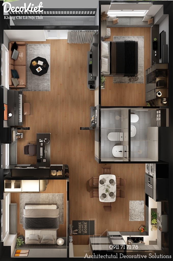 Đến với dự án lần này DECOVIET đã lựa chọn phong cách hiện đại mang hiệu ứng sang trọng, thanh lịch nhưng không kém phần ấm cúng. Cùng chúng tôi xem qua những hình ảnh thiết kế nội thất chung cư 2 phòng ngủ dưới đây để trải nghiệm một không gian sống đầy thẩm mỹ và tiện nghi.