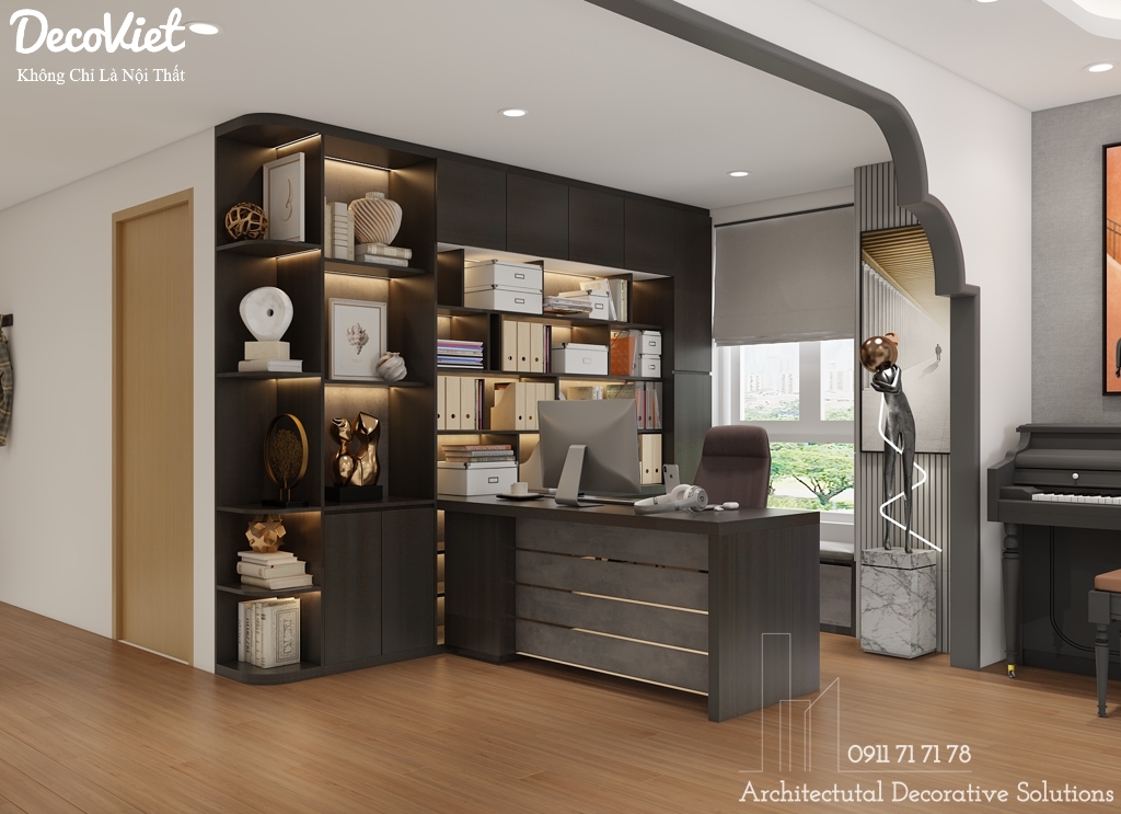 Tủ sách, bàn làm việc khéo kéo nhấn nhá không gian bằng chất liệu và chi tiết nội thất độc đáo.