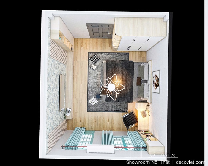 Tất cả nội thất trong phòng đều được thiết kế thi công logic, tạo nên sự luân chuyển không khí và ánh sáng tốt. Từ giường, tủ, bàn làm việc cho đến hệ kệ tivi treo tường, mọi chi tiết đều được tính toán để không làm vướng lối đi và đảm bảo tính thẩm mỹ cao.