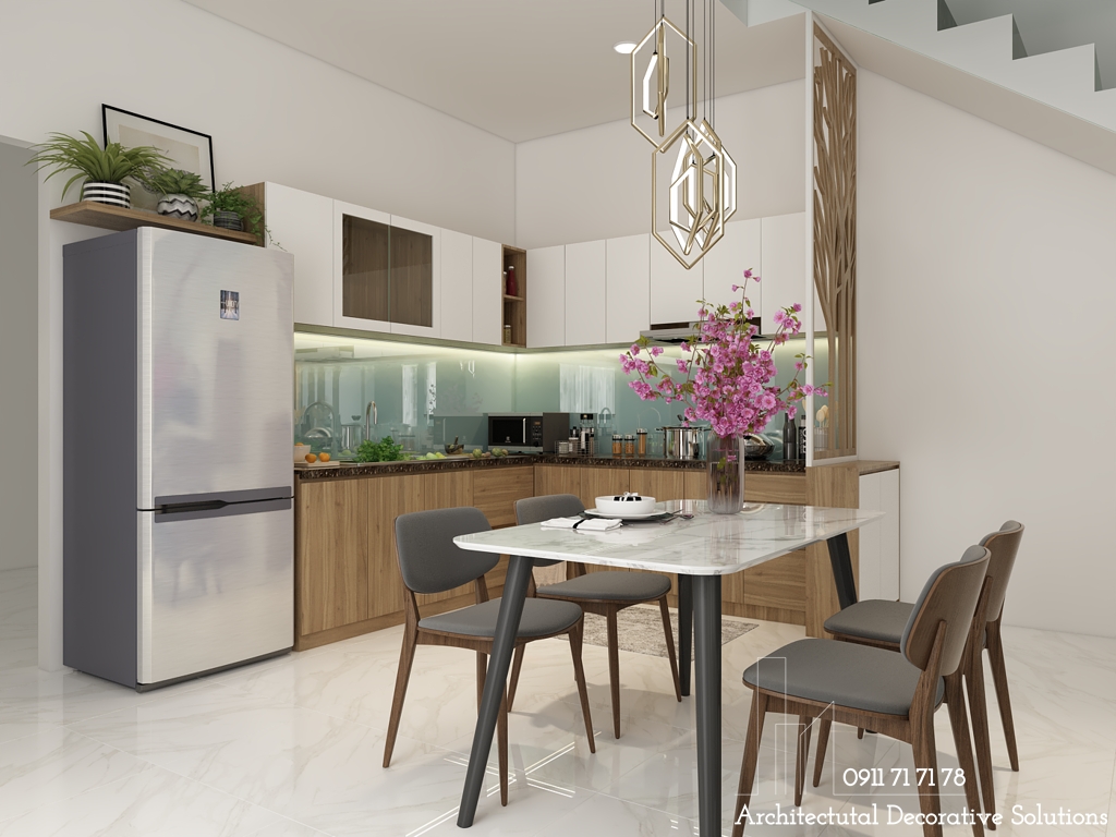Đặc biệt với lối thiết kế không gian mở, phòng khách và bếp đều có những điểm nhấn riêng biệt và độc đáo. Bộ bàn ghế sofa đẹp mắt với màu xám trung tín, thiết kế liên thông khu vực bếp khiến không gian trở nên rộng rãi hơn. Không gian bếp thiết kế phía trong, hệ thống đèn thả dài khu bàn ăn tạo điểm nhấn mạnh mẽ. Thiết kế tủ bếp chữ L tận dụng tối đa diện tích, sự phối màu hài hòa mang đến cảm giác hài hoà, tươi mới và hiện đại hơn.