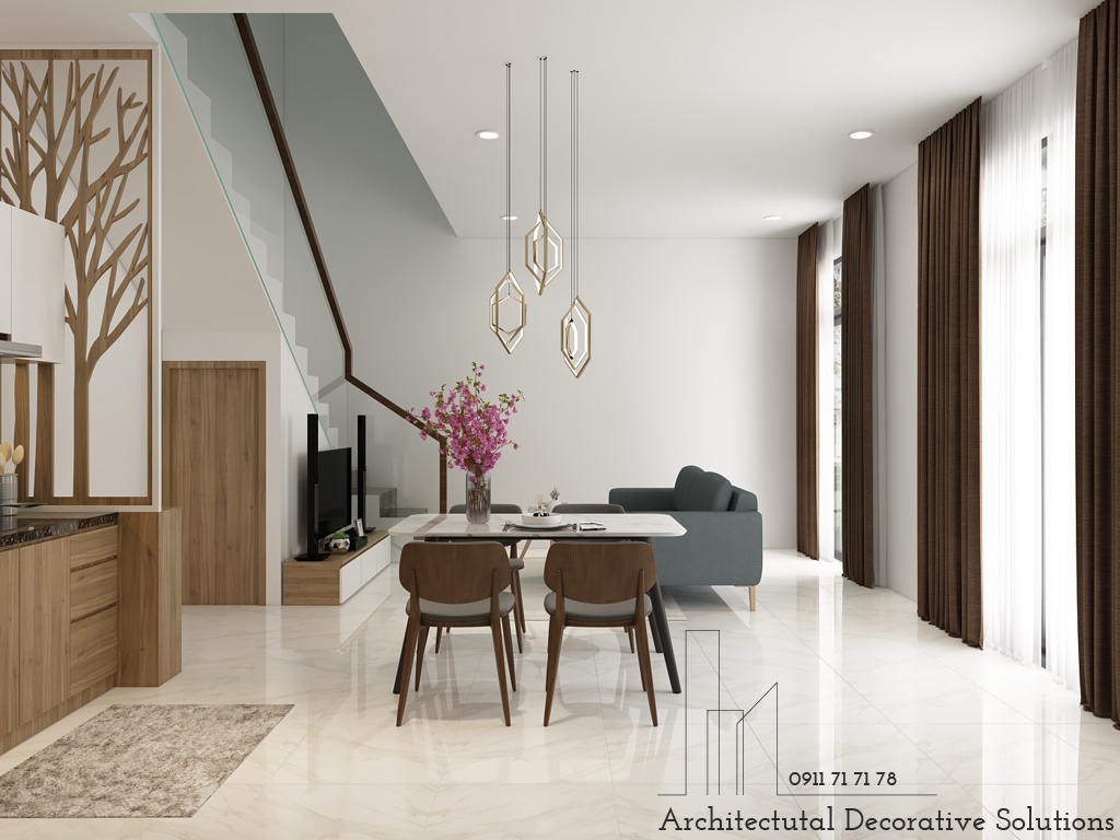 Qua phối cảnh mẫu thiết kế này, các KTS của DecoViet đã cho thấy phòng khách được thiết kế tinh tế với những vật dụng nội thất hiện đại cần thiết (ghế sofa, kệ tivi…), không có chi tiết dư thừa nào, nhằm mang đến một không gian thoáng đãng nhất cho ngôi nhà.