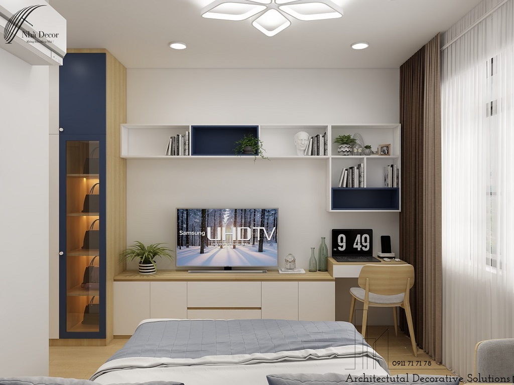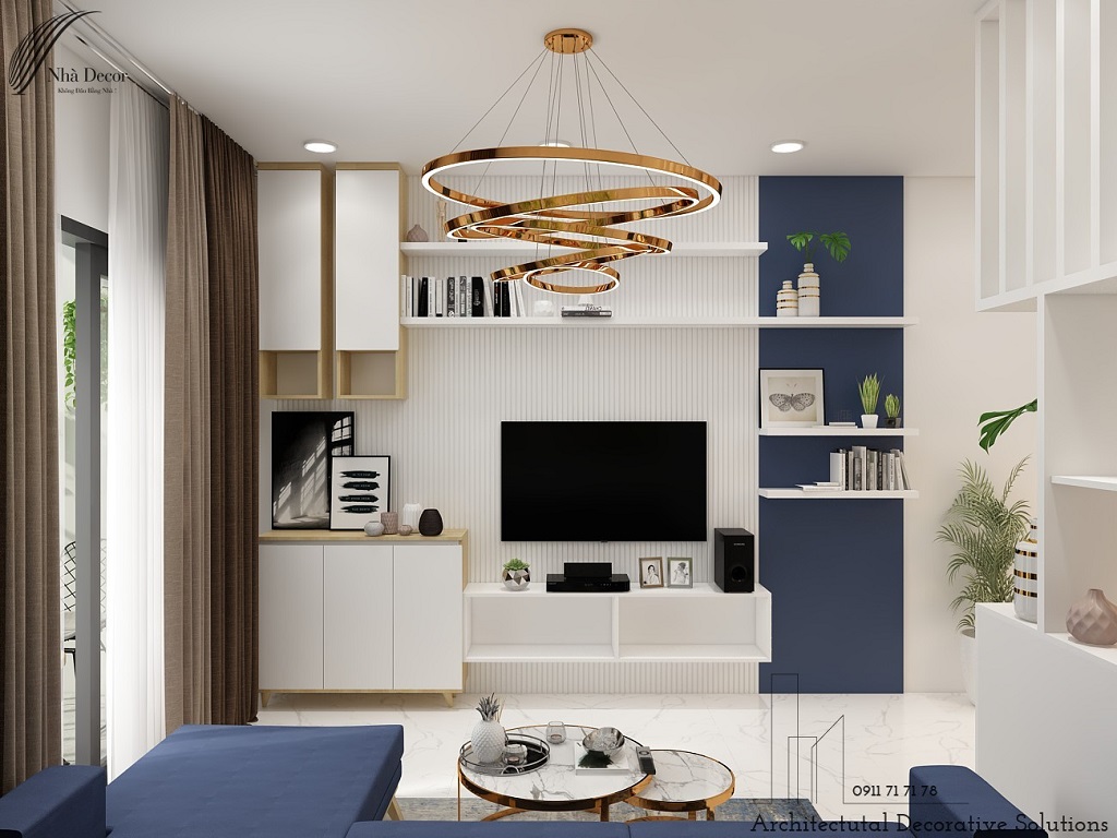 Tivi gắn tường, phía dưới là kệ trang trí thiết kế đơn giản.