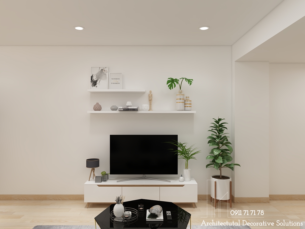 Kệ tivi thiết kế đơn giản nhưng vẫn đảm bảo đầy đủ công năng. Thiết kế nhỏ gọn không rườm rà làm tăng thêm sự rộng rãi cho không gian nhỏ này.