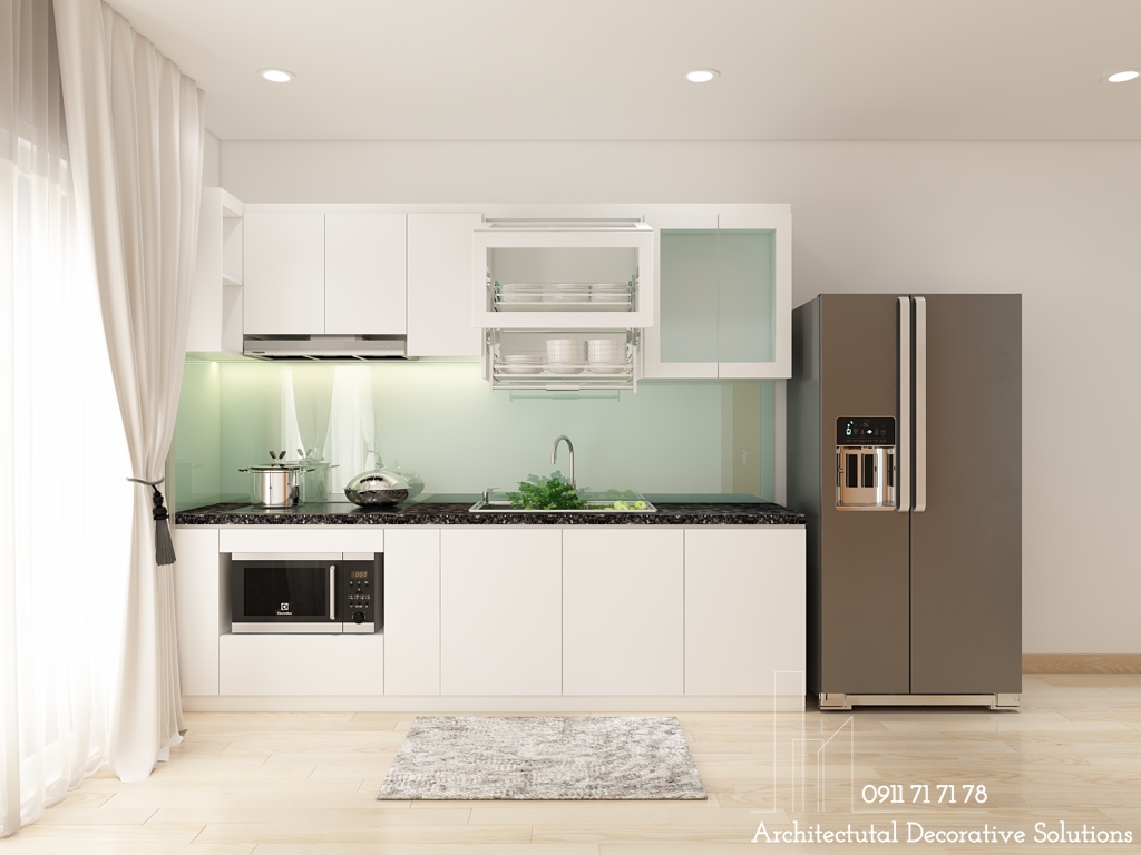 Tủ bếp chữ I hiện đại tối giản với hai gam màu trắng và mặt đá đen sang trọng. Điểm nhấn màu xanh giúp không gian bếp thêm phần thoáng đãng cho các bà nội trợ khi nấu nướng.