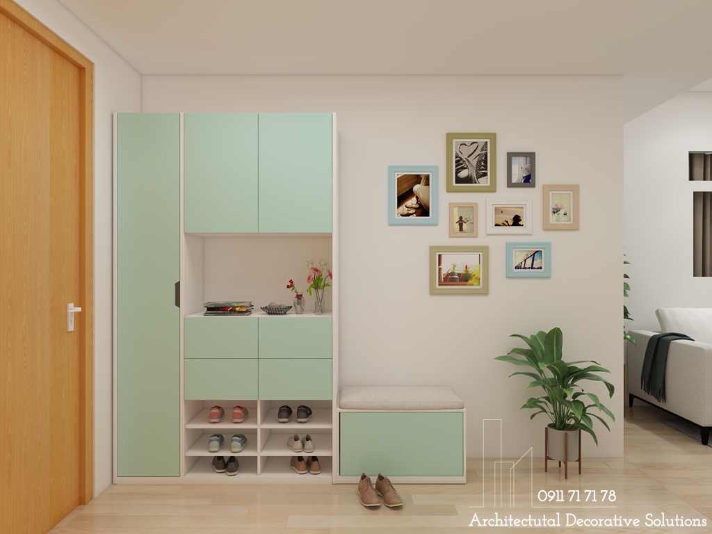 Tủ lưu trữ kết hợp tủ giày ở cửa ra vào giúp tiết kiệm tối đa không gian lưu trữ. Đồng thời mang lại sự tiện nghi và hiện đại cho tổng thể căn hộ.
