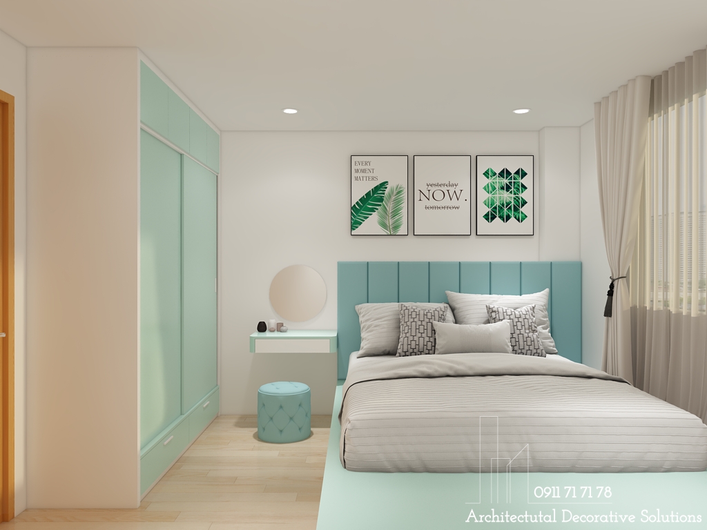 Phòng ngủ với diện tích khiêm tốn nhưng được bố trí nội thất hợp lí và khoa học. Đảm bảo các đồ dùng nội thất cần thiết như giường ngủ, tủ quần áo, bàn trang điểm,... Thiết kế cửa sổ lấy sáng giúp diện tích căn phòng như được cơi nới ra thêm.