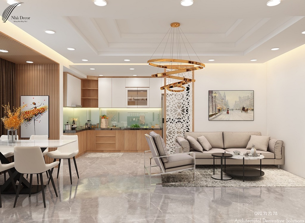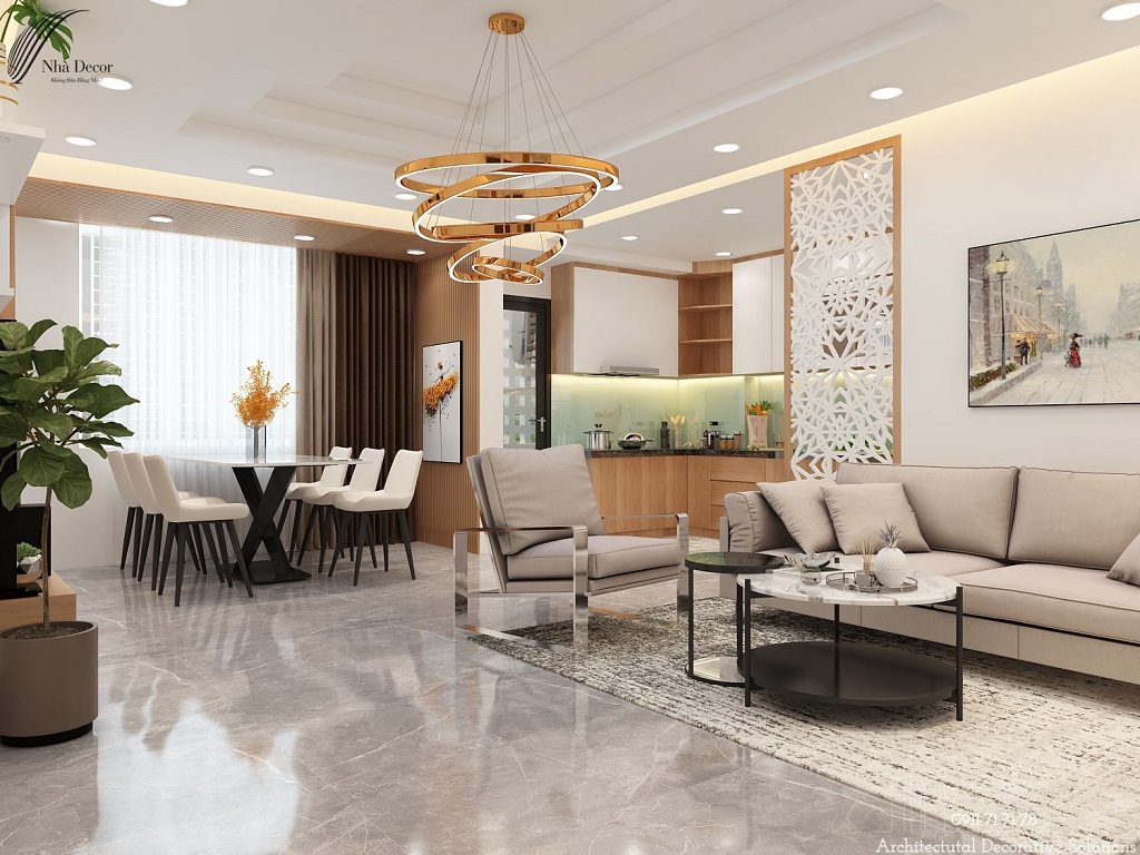 Căn hộ gam màu trung tính kết hợp với nội thất cao cấp tạo nên không gian vừa sang trọng vừa hiện đại, tiện nghi.
