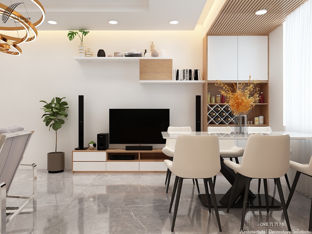 Kệ tivi được thiết kế gần bàn ăn thuận tiện cho việc vừa ăn bữa cơm sum họp, vừa xem những tin tức thời sự hay những bộ phim yêu thích cùng gia đình.
