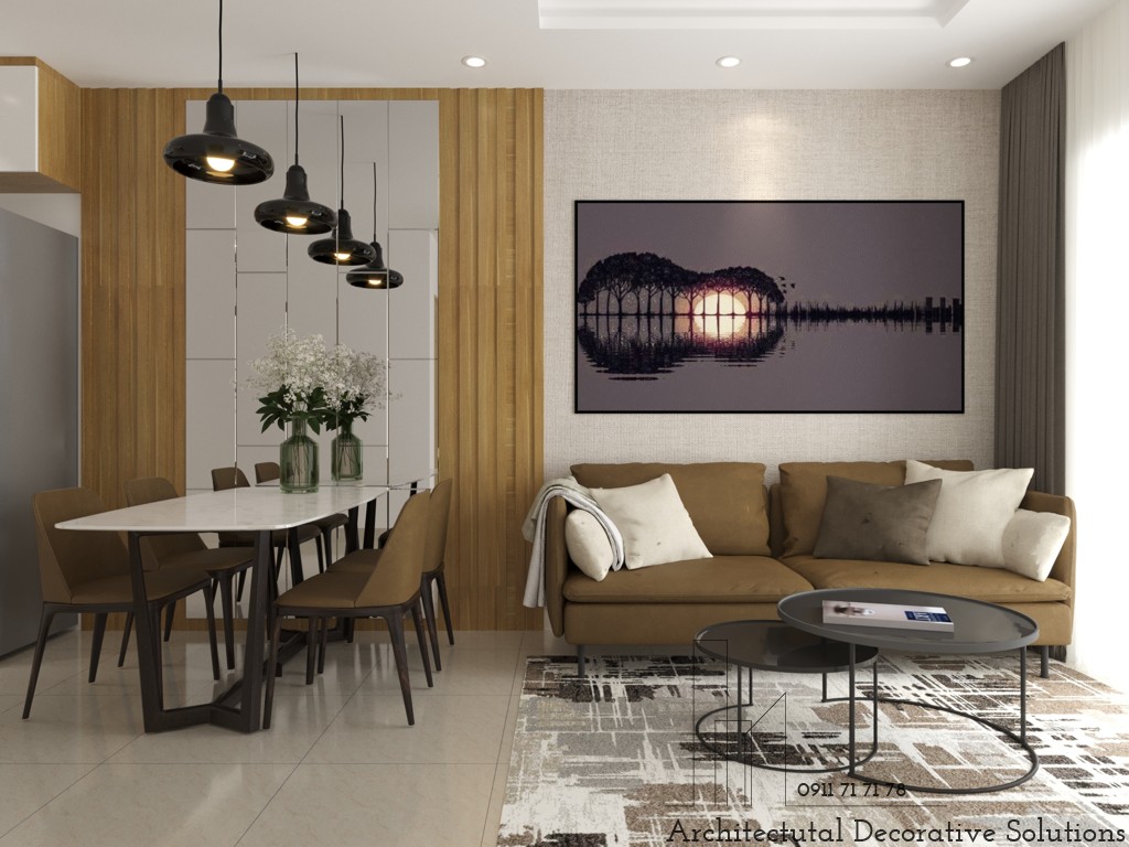 Bước đến không gian phòng khách bạn sẽ thấy ngay được sự đồng nhất về phong cách thiết kế. Bởi trên mảng tường tối màu được tô điểm bằng bức tranh nghệ thuật nổi bật, đầy sáng tạo. Căn hộ tuy sử dụng màu tối nhưng không tối. Đó là cách trang trí vô cùng sáng tạo và đầy tinh tế.