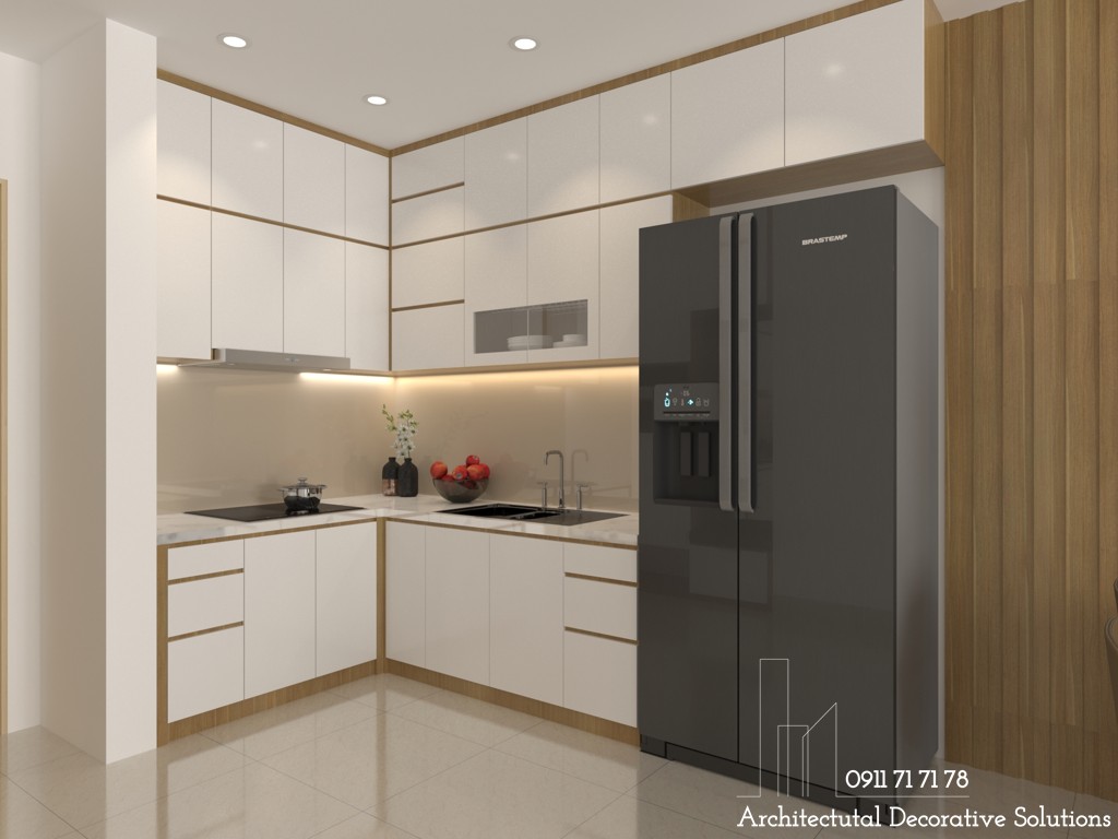 Thiết kế bếp bố trí kiểu chữ L hiện đại. Nội thất nhỏ gọn, tiện dụng nhưng có điểm nhấn. Tủ bếp có nhiều ngăn lưu trữ tiện lợi.