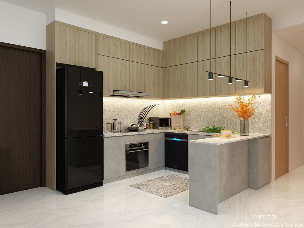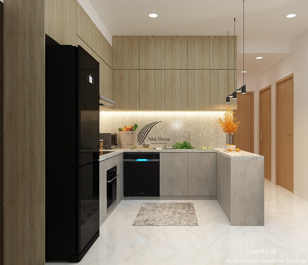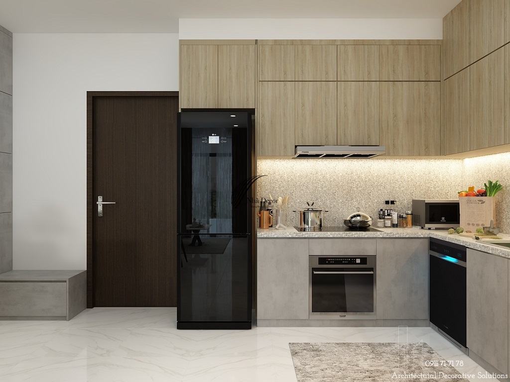 Phòng bếp thiết kế hiện đại, đồng bộ về màu sắc, có sự kết nối với nội thất tổng thể trong cả căn nhà. Kệ bếp chữ L sẽ là sự lựa chọn tuyệt vời, giúp sắp xếp đồ đạc gọn gàng và kín đáo.