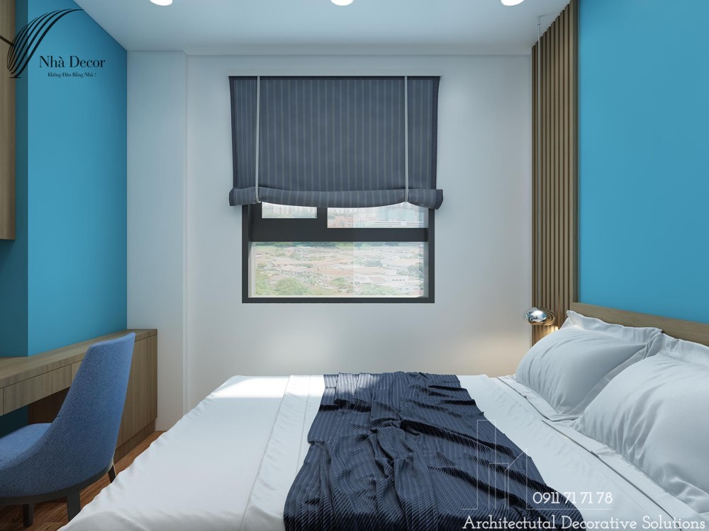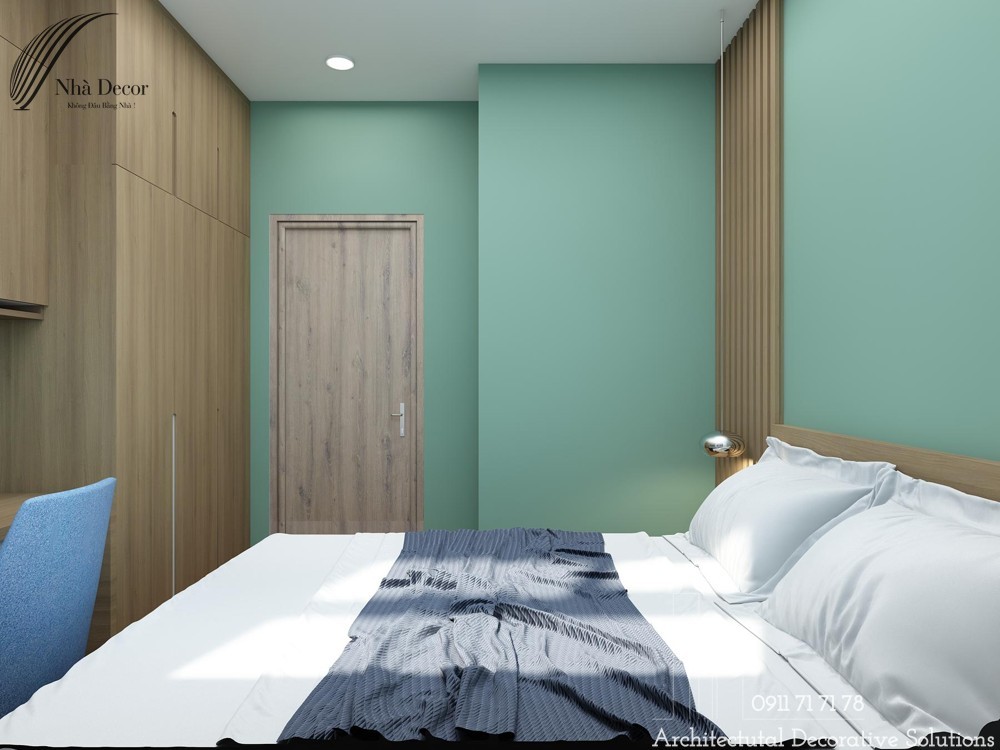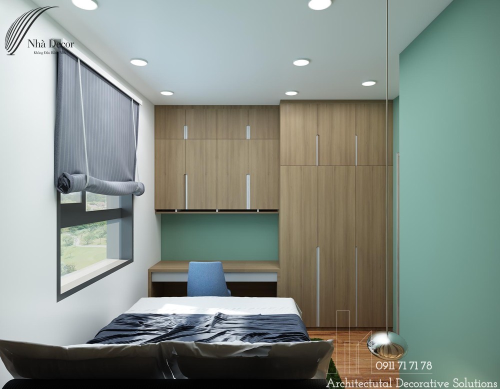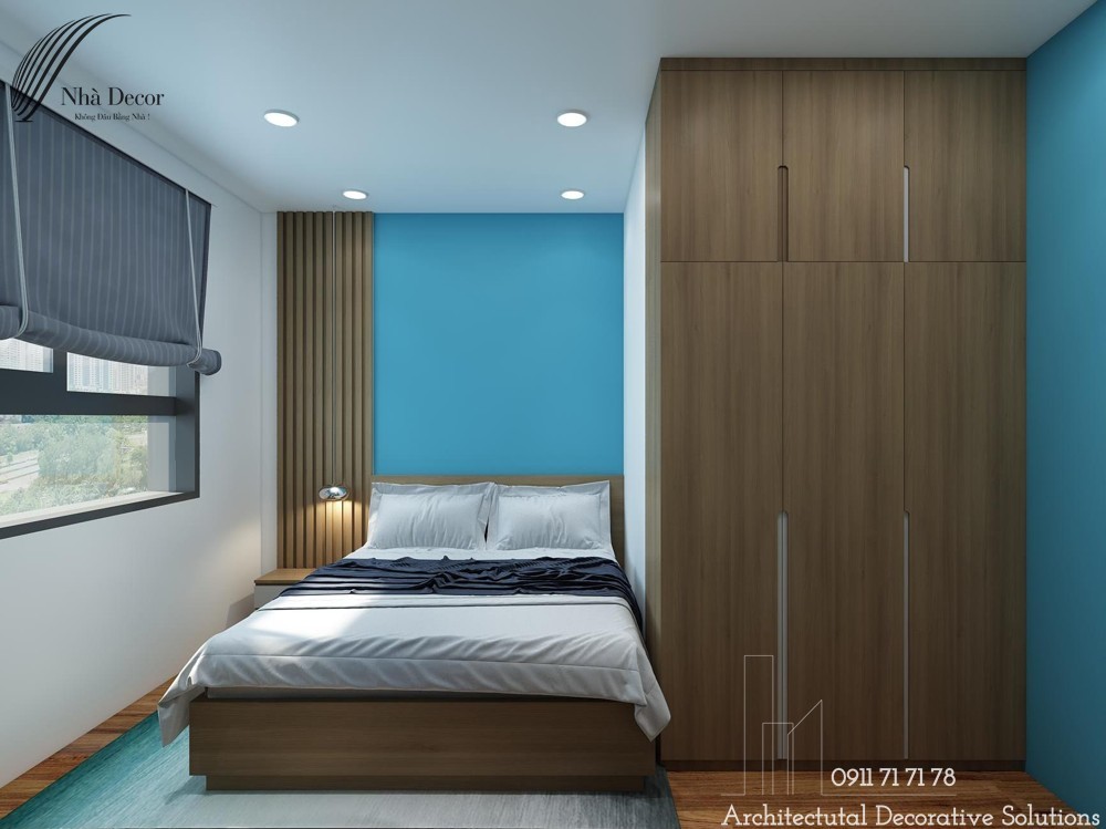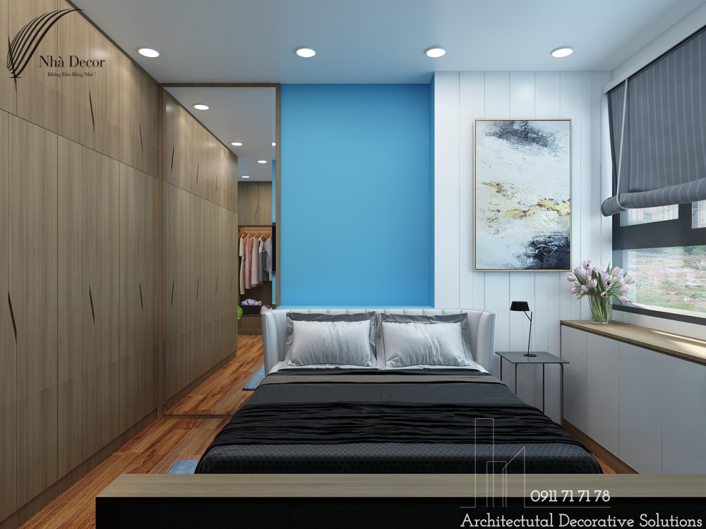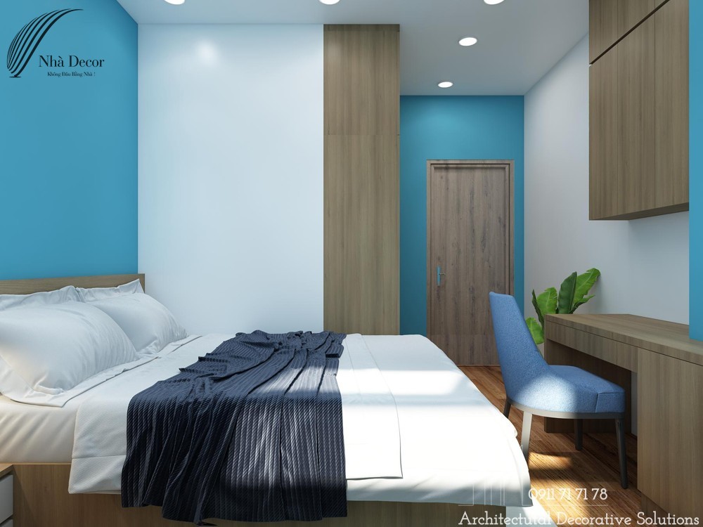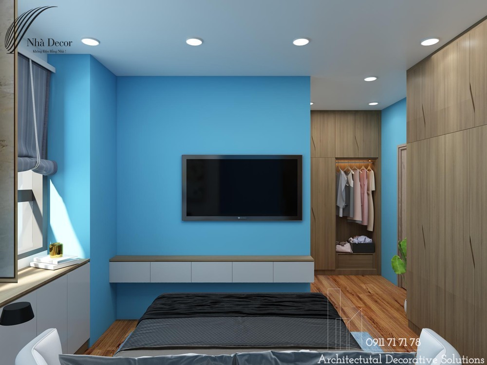 Phòng ngủ được thiết kế đơn giản dựa trên tiêu chí của gia chủ đề ra. Không gian phải vừa đủ cho tủ quần áo, giường lớn, cùng kệ tivi chính vì thế tất cả phải được thiết kế một cách tiện dụng.