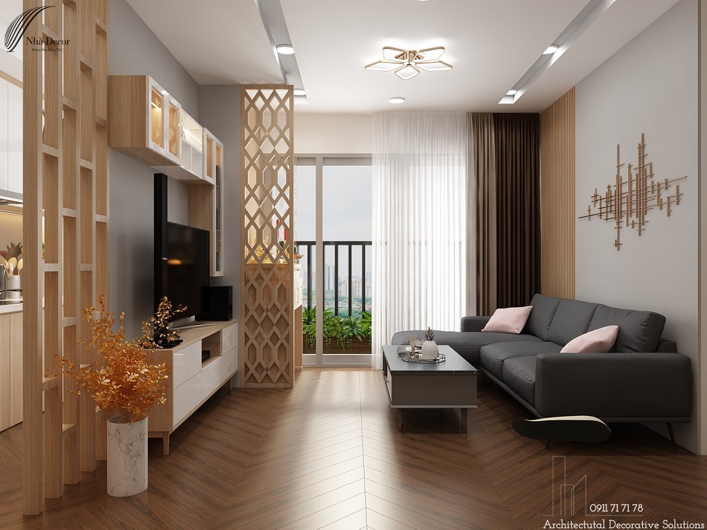 Phòng khách căn hộ Vinhomes Central Park mang đến cho gia chủ không giansang trọng hiện đại, căn hộ có gam màu trung tính từ gỗ tự nhiên đẹp mắt.
