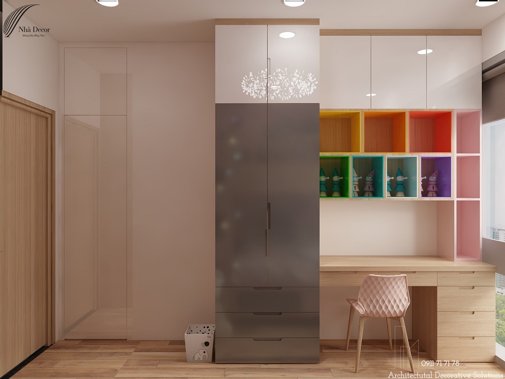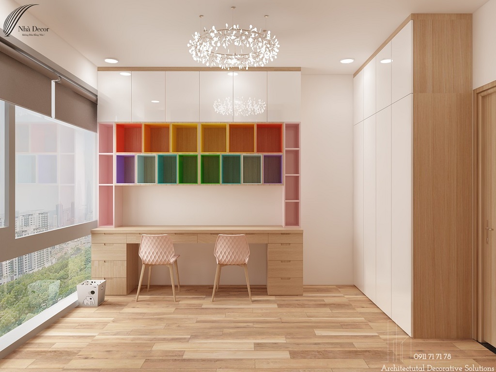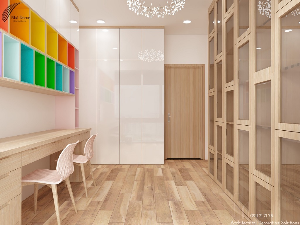 Với hệ thống kệ tủ đầy màu sắc là nơi cho bé yêu thỏa sức vui chơi sáng tạo