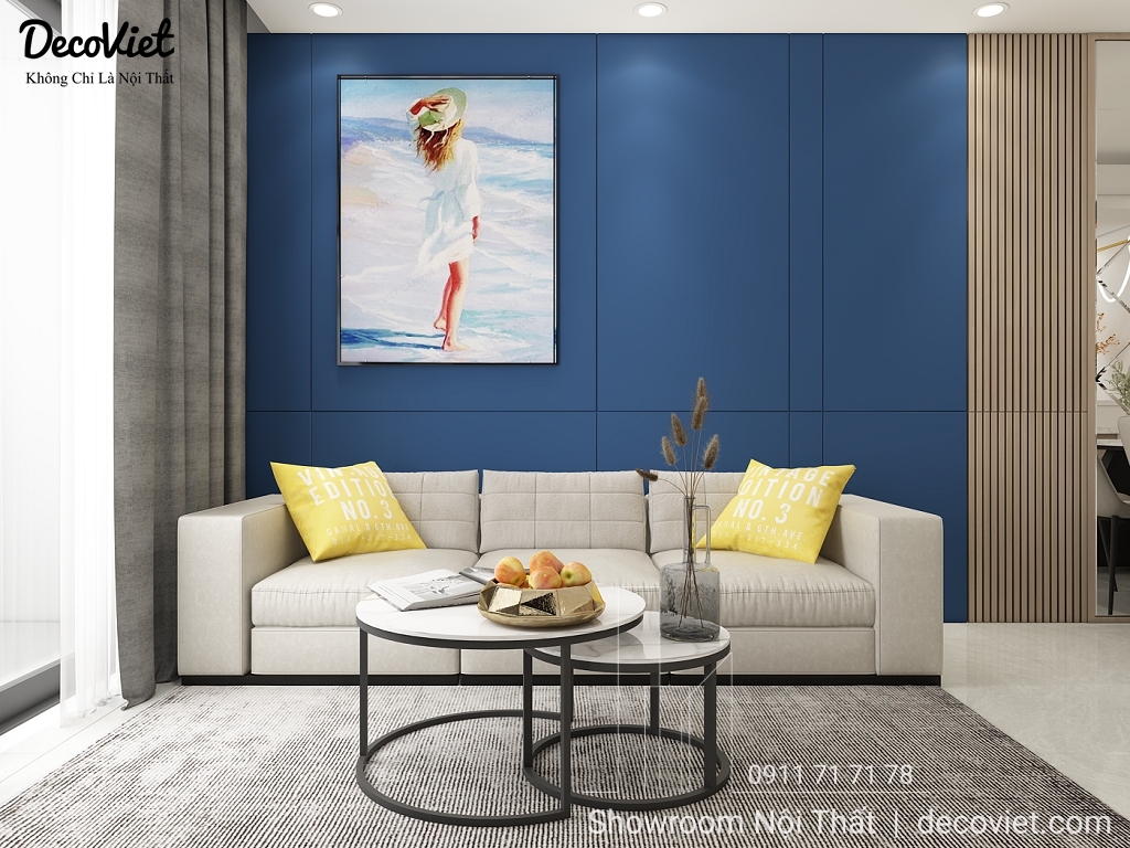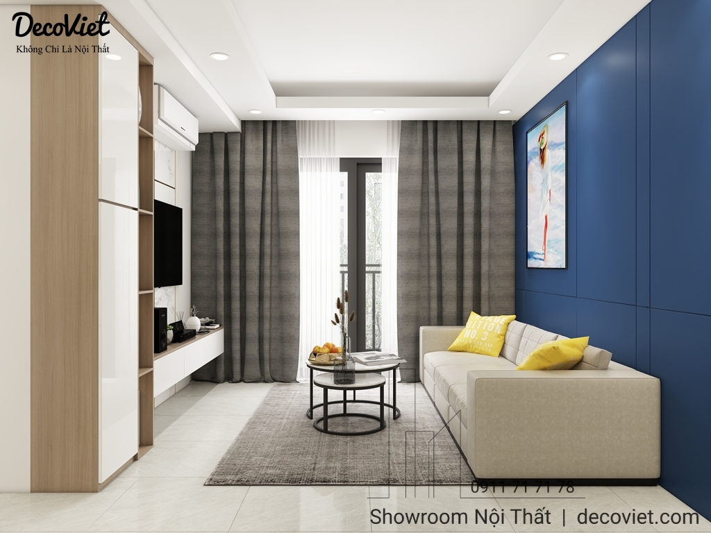 Thiết kế nội thất phòng khách trông bắt mắt hơn khi sử dụng gối sofa, giấy dán tường có màu vàng nổi bật. Mảng tường phía sau sofa được khoác một màu xanh dương nhẹ nhàng, giúp căn phòng mát mẻ, tươi mới hơn rất nhiều.