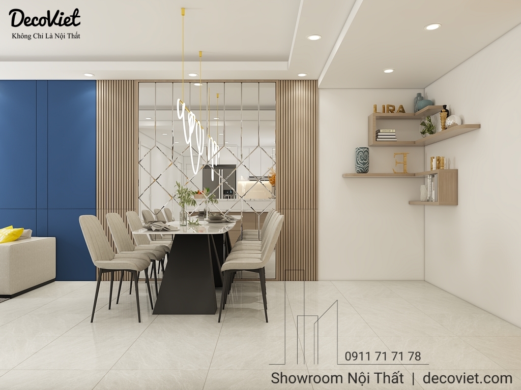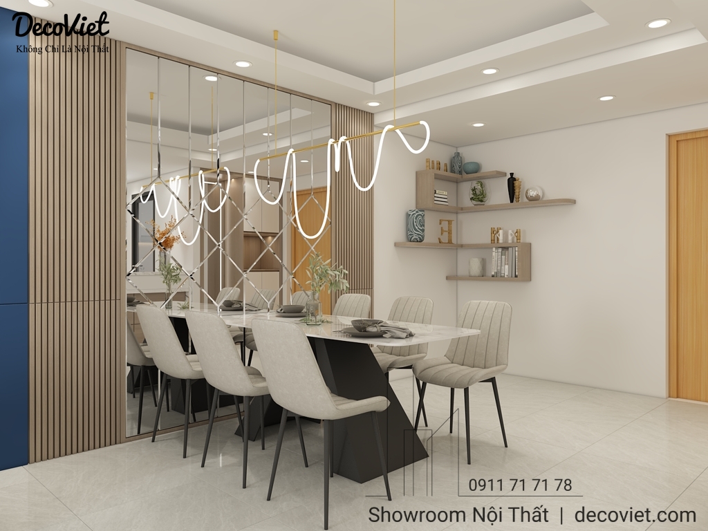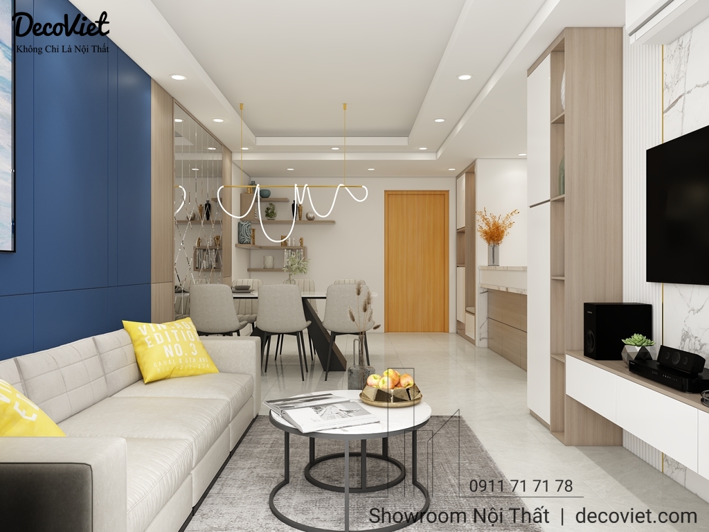 Thiết kế nội thất hiện đại được thể hiện rất tinh tế và sáng tạo bằng cách thiết kế phá cách từ ghế sofa đến bàn ghế ăn đều tạo ấn tượng đặc biệt cho khách đến thăm nhà. Bên cạnh đó, thiết kế căn hộ theo phong cách hiện đại kết hợp với nội thất gỗ công nghiệp tạo nên không gian rộng rãi và vô cùng ấm cúng.