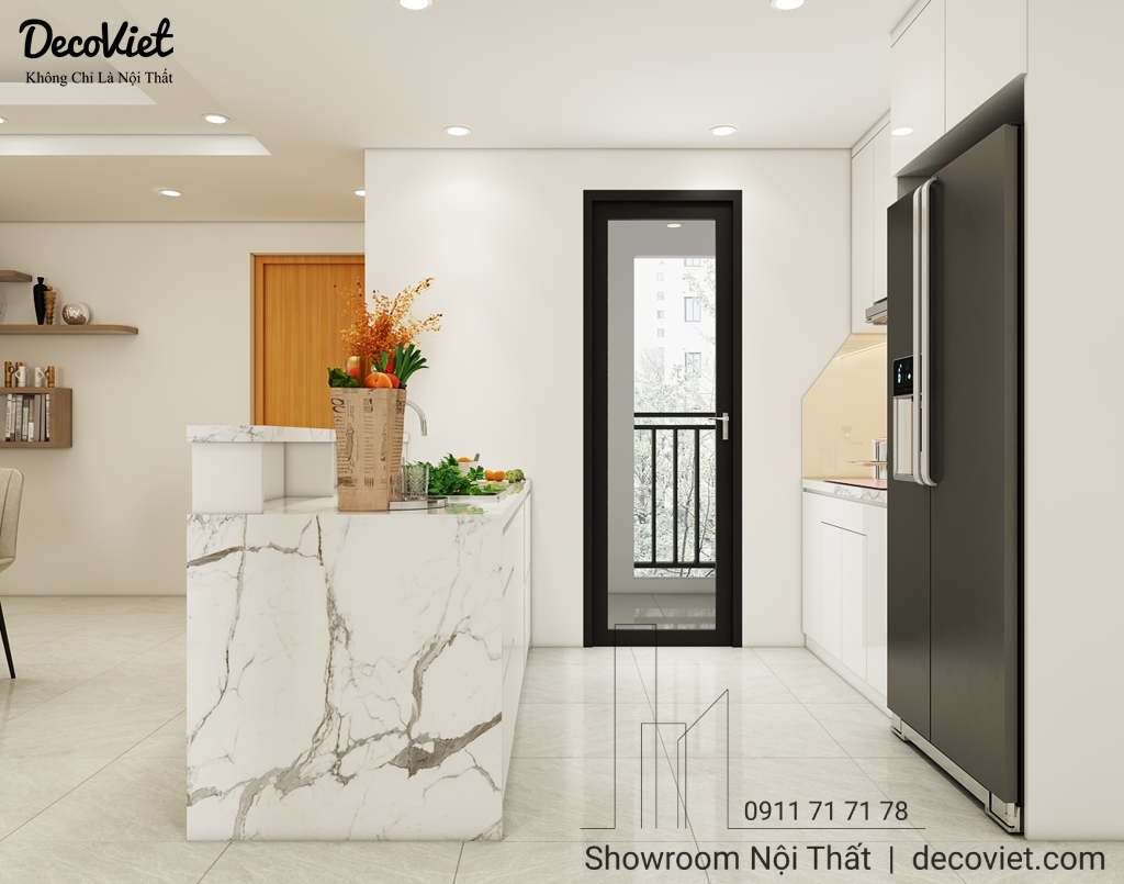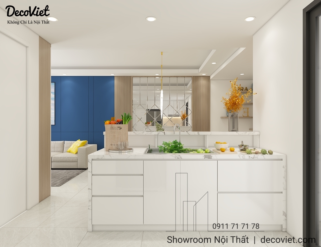 Toàn bộ không gian sinh hoạt chung của Thiết Kế Nội Thất Chung Cư 2 Phòng Ngủ Masteri Thảo Điền như khách, bếp – bàn ăn đều thiết kế mở hiện đại. Từ cửa chính bước vào nhà là góc nấu nướng và ăn uống của gia chủ. Kế đó là phòng khách thoáng sáng, rộng rãi cạnh ban công. Hai khu vực chức năng liền mạch để tăng sự kết nối với nhau, tăng thêm chức năng hữu ích cho cuộc sống thường ngày.