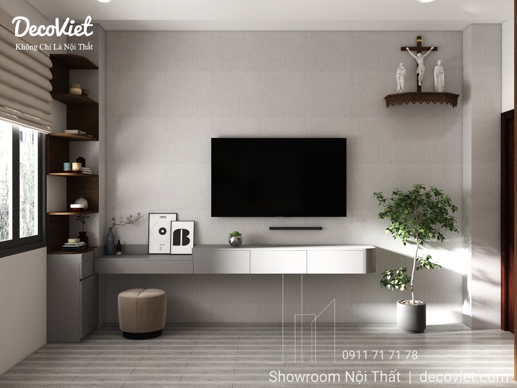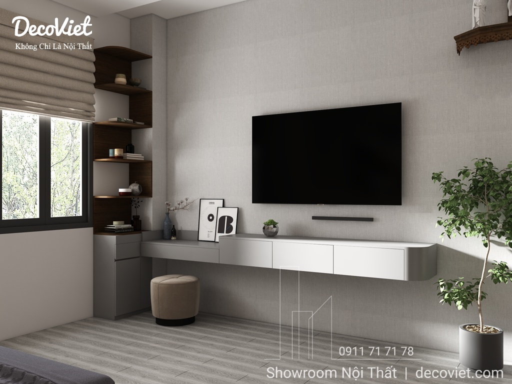 Một mẫu kệ tivi treo tường kết hợp với bàn trang điểm cùng sự độc đáo về độ cao sẽ tạo được điểm nhấn cho không gian phòng ngủ. Bố trí các hộc kéo tiện lợi cho việc cất giữ các vật dụng cá nhân. Đặt một chậu canh xanh cho không gian nghỉ ngơi thêm phần tươi mới và năng lượng. Mẫu kệ trang trí với kiểu dáng độc đáo cũng vô cùng ấn tượng, giúp phòng ngủ thêm sinh động và tiện nghi.