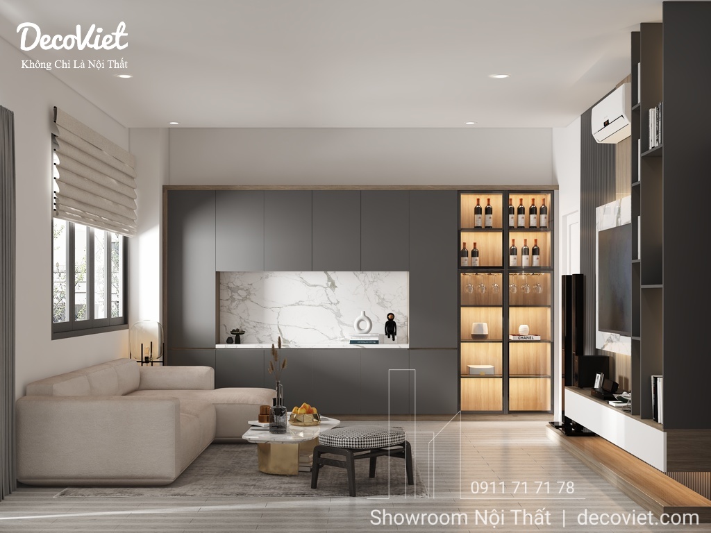Đồng thời chiếc tủ được thiết kế đụng trần giúp tăng không gian lưu trữ đáng kể. Tủ rượu được tích hợp, sử dụng cánh kính cùng hệ đèn led đặc biệt, giúp không gian phòng khách thêm sang trọng và thời thượng hơn.