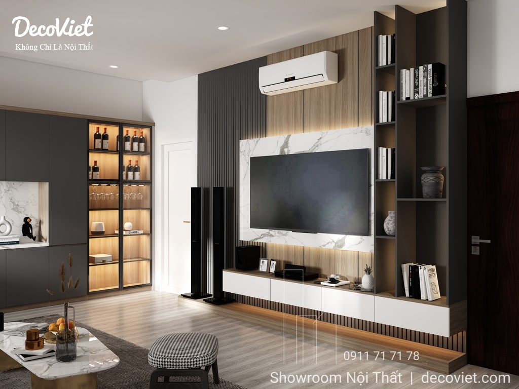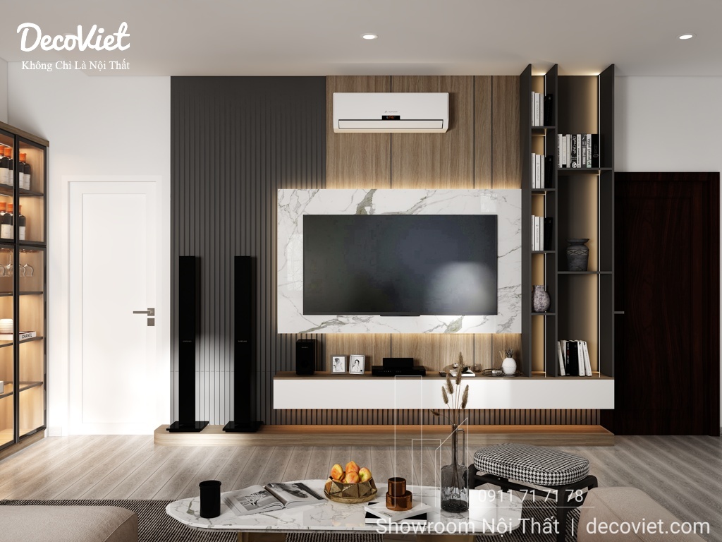 Ngoài bộ bàn ghế sofa bắt mắt, hệ kệ tivi gỗ độc đáo cũng được sử dụng để tạo điểm nhấn cho không gian. Được thiết kế treo tường tiện lợi, mẫu kệ tivi đẹp này được kết hợp với kệ trang trí sẽ biến không gian sống trở nên lý tưởng hơn. Từng chi tiết đều được tính toán tỉ mỉ để tạo ra một tổng thể hoàn chỉnh, vừa đáp ứng công năng sử dụng, vừa mang lại vẻ đẹp thẩm mỹ cao cho phòng khách.