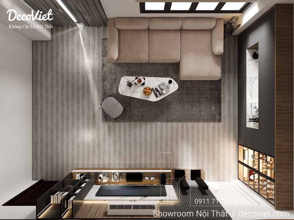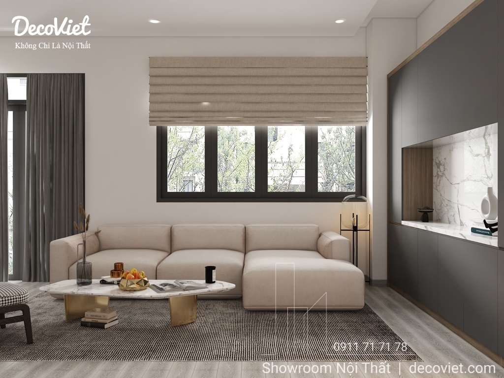 Thiết kế nội thất phòng khách sẽ không thể hoàn thiện nếu thiếu đi một bộ bàn ghế sofa phòng khách đẹp. Đây chính là điểm nhấn nổi bật giúp thể hiện được gu thẩm mỹ cũng như phong cách của gia chủ. DecoViet đã lựa chọn mẫu ghế sofa cao cấp với dạng khối hình học độc đáo, thiết kế chữ L giúp tiết kiệm không gian diện tích tốt. Bàn trà sofa mặt đá là đặc trưng của một phòng khách hiện đại, khi kết hợp với mẫu ghế sofa đẹp sẽ tạo nên không gian tiếp khách sang trọng và đẳng cấp.