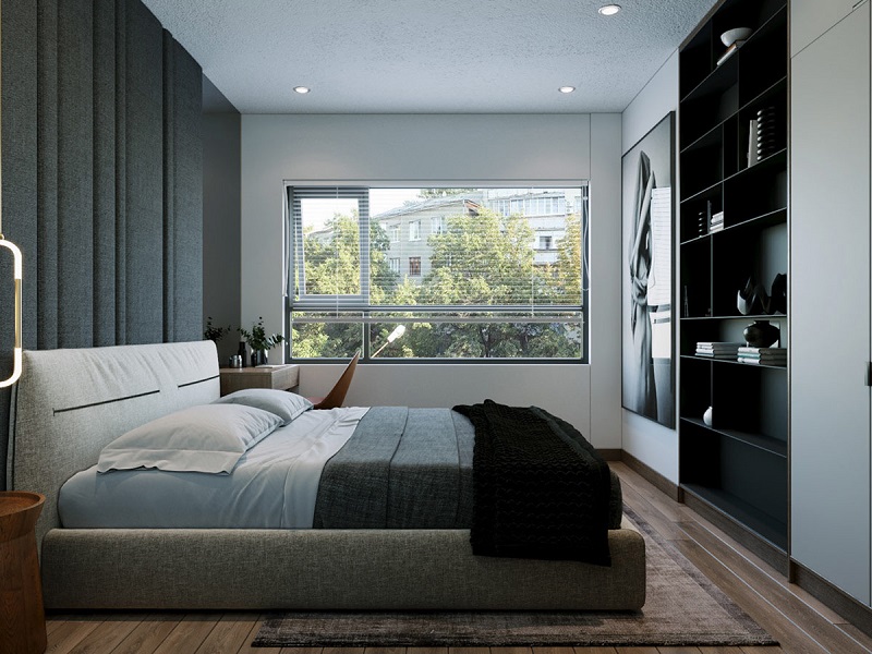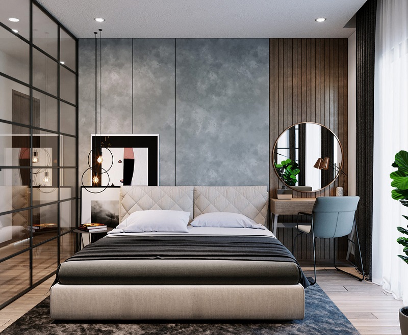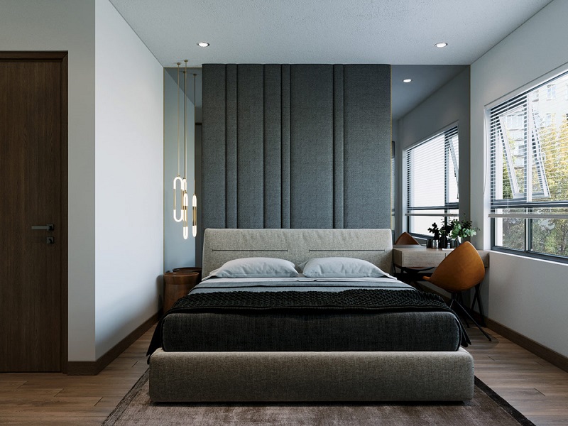 Trong phòng ngủ, vải bọc màu xám lót đầu giường từ sàn đến trần là đặc điểm của không gian được bao bọc bởi vách kính này, cùng hệ cửa sổ view tầm mắt giúp làm dịu thị giác và âm thanh. Chiếc đèn phòng ngủ được lặp lại từ phòng ăn tới phòng ngủ, chiếc đèn được treo lủng lẳng trở thành bộ đôi với chiếc giường hiện đại.