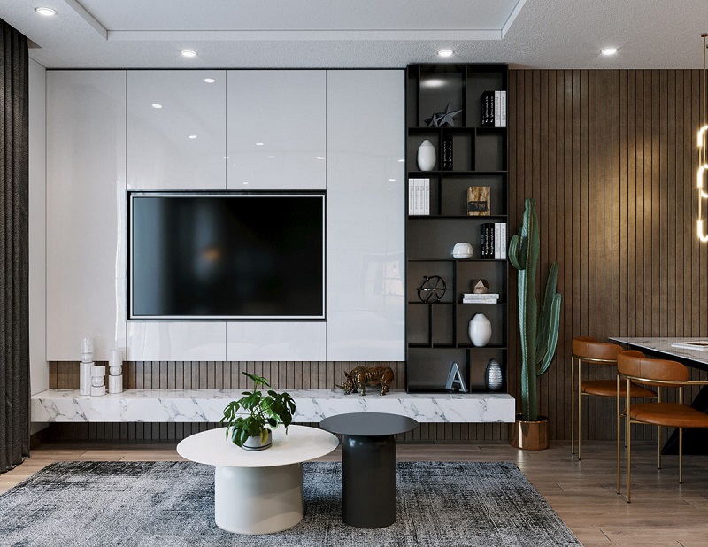 Bàn sofa đôi tròn màu đen và trắng kết hợp cùng kệ tivi mặt đá cẩm thạch vân mây xám đã tạo nên một không gian sang trọng.