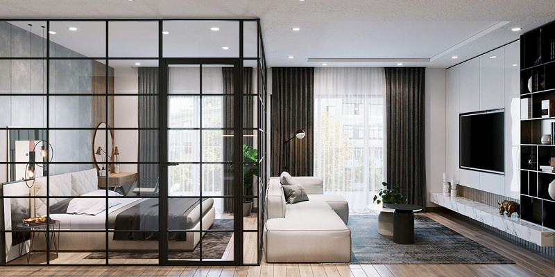 Hệ tường kính giúp phòng khách rộng hơn và phòng ngủ sẽ hứng được ánh nắng dễ dàng tràn vào phòng, mặc dù diện tích khá nhỏ, nhưng đây thực sự là một không gian như mơ mà ai cũng muốn sống ở đó. Một rèm màu xám đen và đồ nội thất được kết hợp với nhau để tạo nên một trạng thái cân bằng cho không gian.