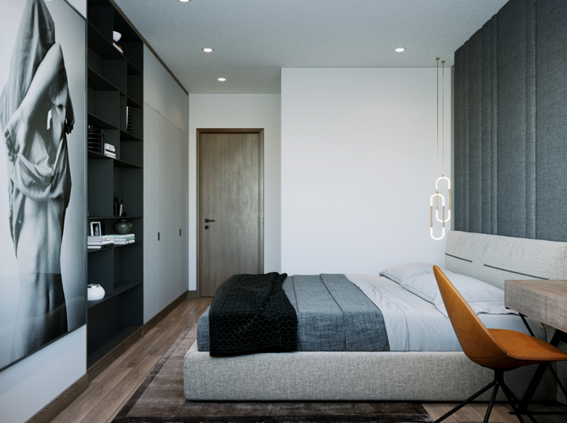 Đặc trưng nổi bật của thiết kế không gian mở này đó là kết hợp các không gian trong căn hộ mà vẫn không làm giảm mục đích sử dụng, bạn có thể trải nghiệm không gian thông thoáng mà không có sự xuất hiện của bức tường ngăn cách vướng víu. Nếu có căn hộ chung cư diện tích nhỏ, và muốn 2 phòng ngủ thì bạn vẫn có thể áp dụng cách này đẻ có thể sắp xếp đủ các phòng cho các thành viên trong gia đình nhưng vẫn cảm thấy thoải mái và rộng rãi. Phòng ngủ được thiết kế đơn giản nhưng sang trọng, trên đây là toàn bộ không gian phòng ngủ.