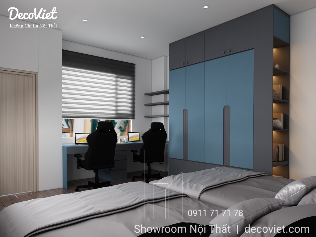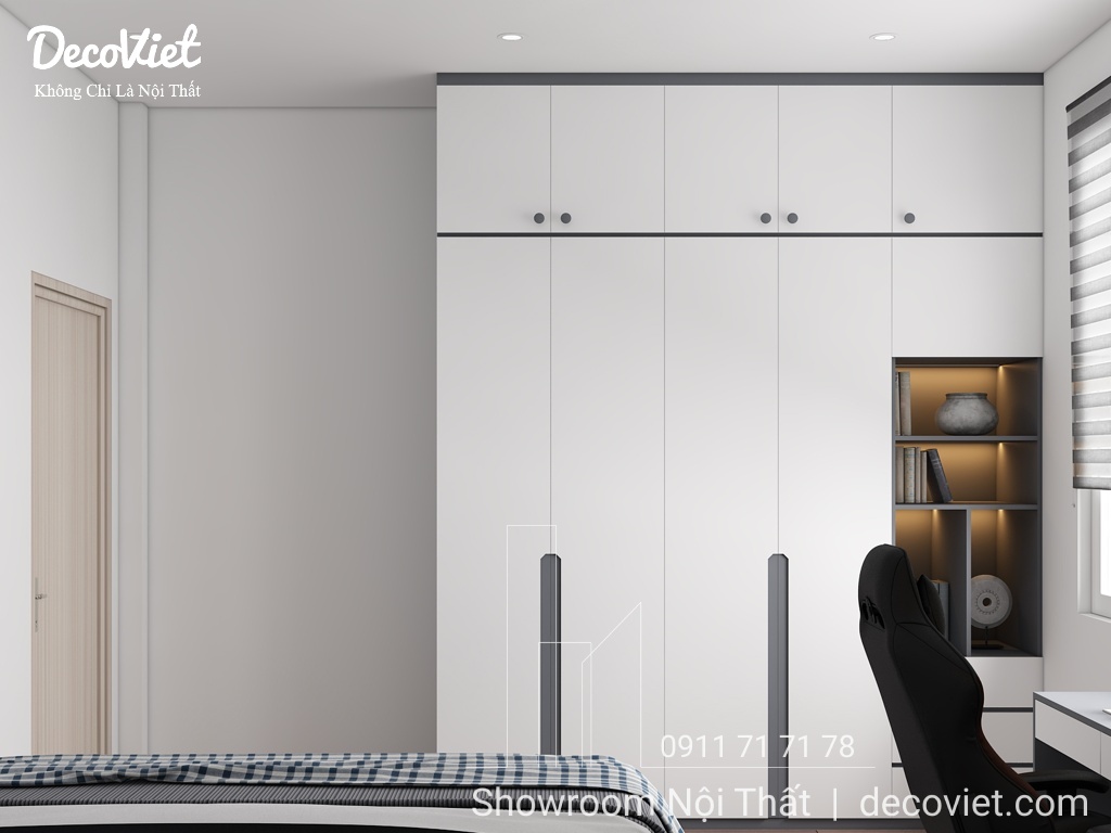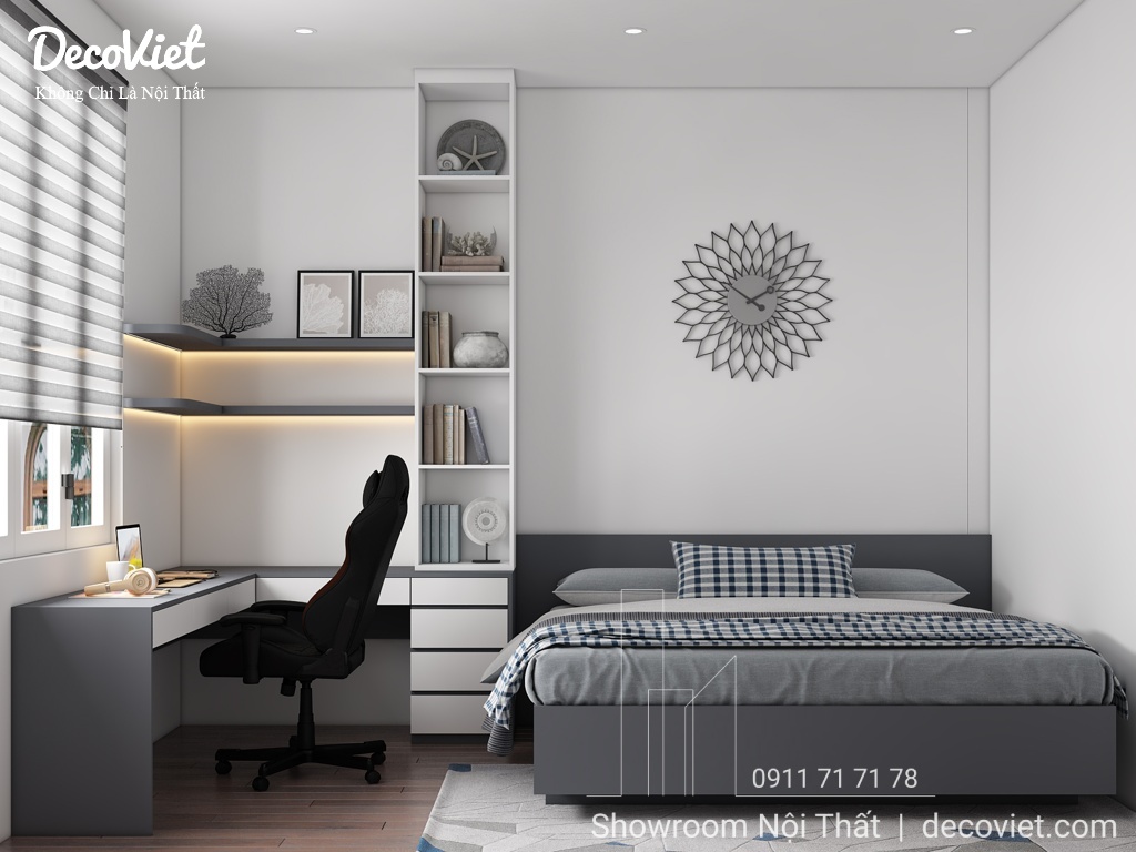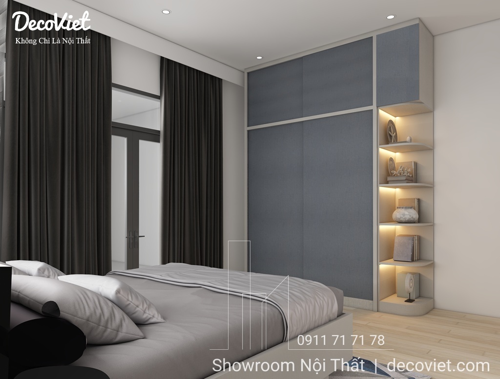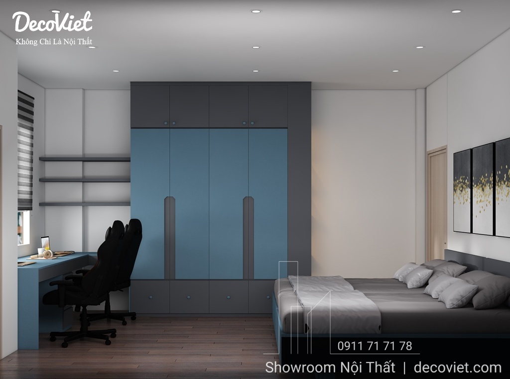 Phòng ngủ nhà phố đẹp được các kiến trúc sư của DecoViet thiết kế tính toán khoa học; đảm bảo thẩm mỹ từ cách bố trí giường ngủ, bàn làm việc, kệ sách, tủ áo; màu sắc; ánh sáng; tạo cảm giác thân thuộc và gần gũi cho chủ nhân căn phòng. Đặc biệt, kết hợp với những món đồ nội thất trang trí khác, căn phòng sẽ trở nên sinh động, nổi bật và thể hiện rõ hơn về sở thích và cá tính.