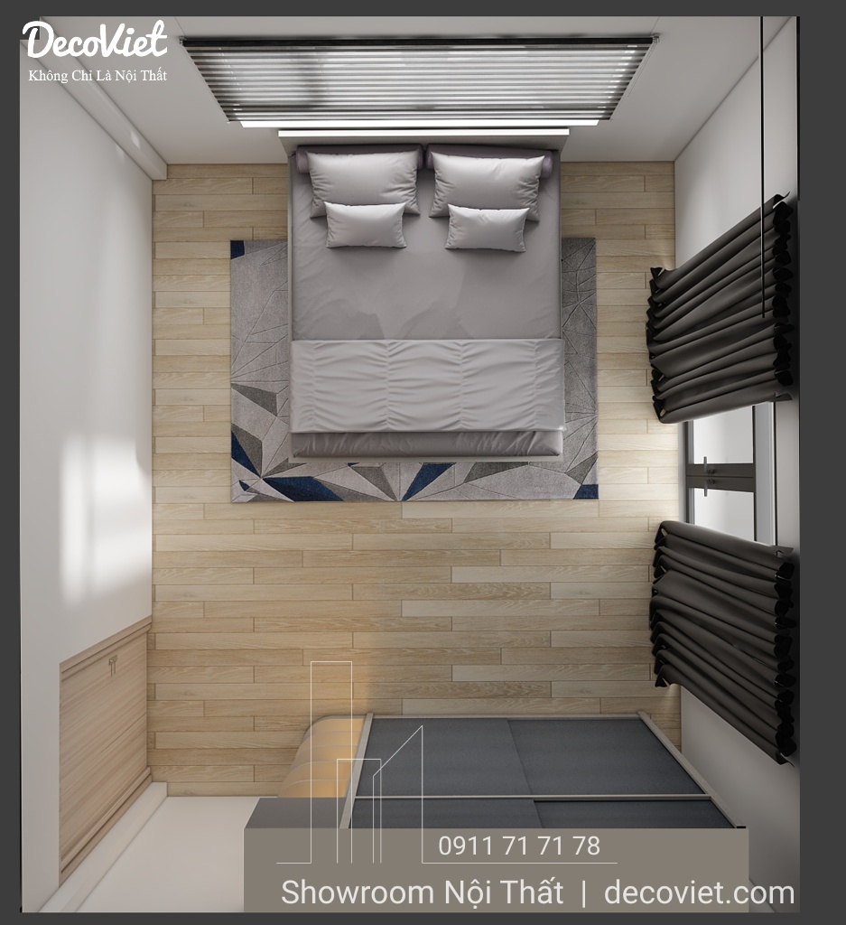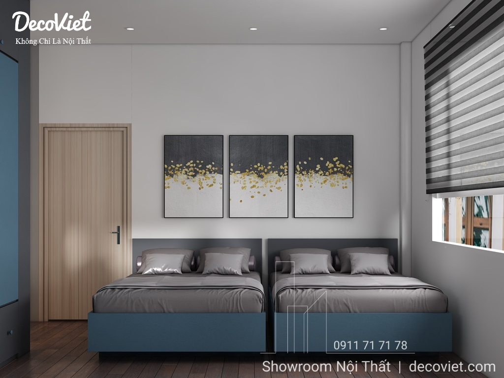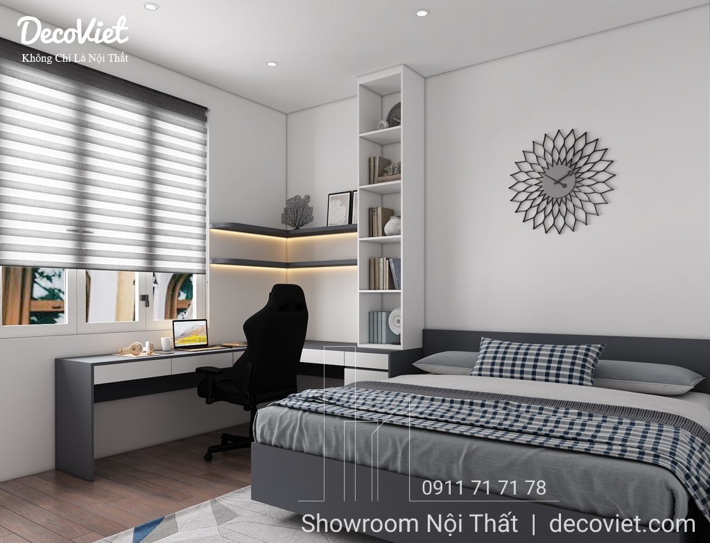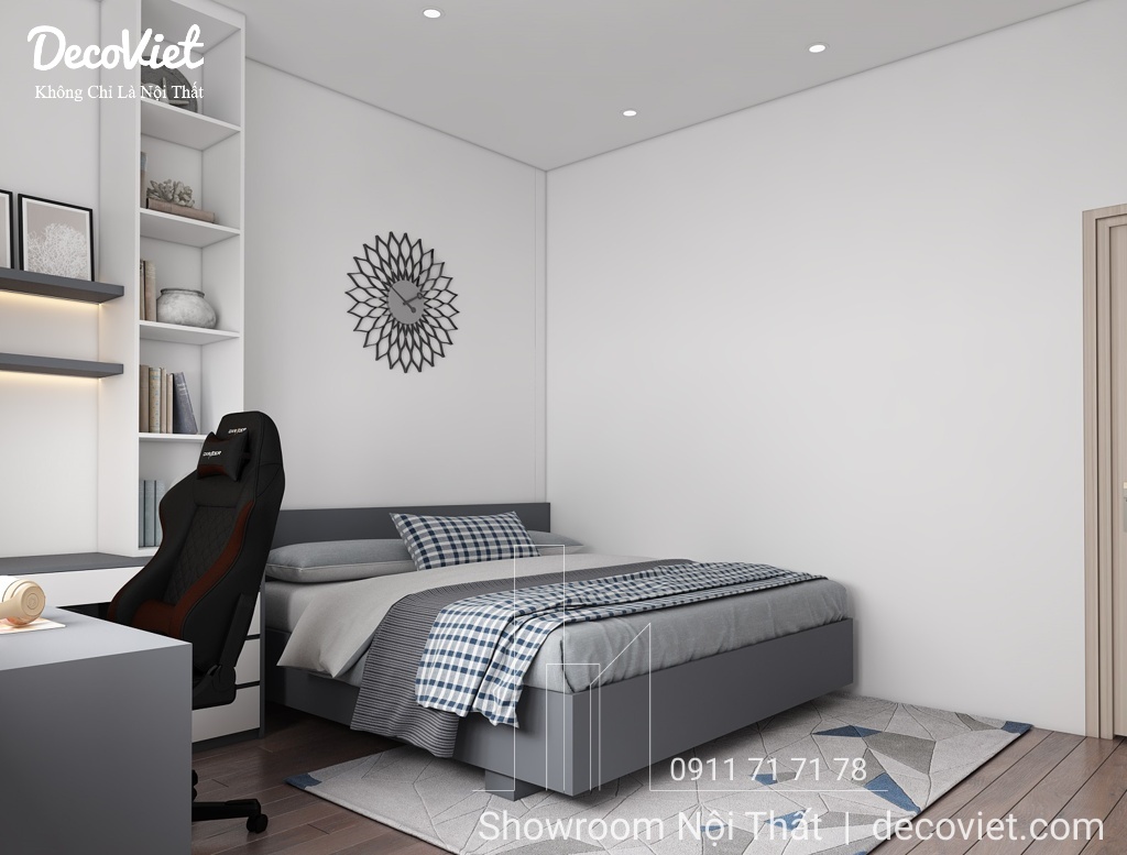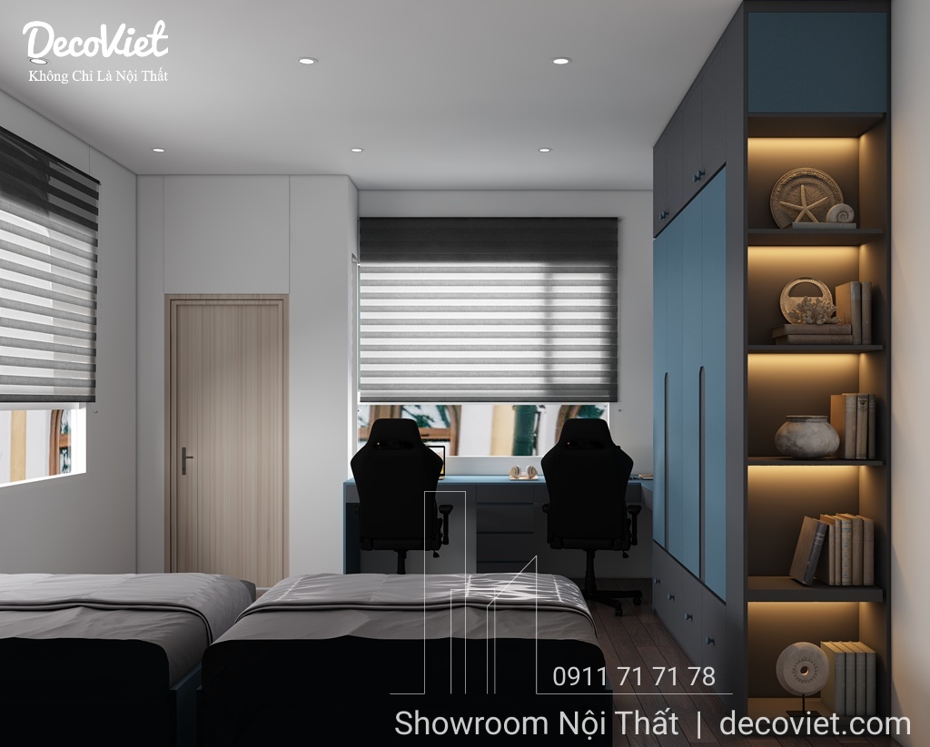 Phòng ngủ nhà phố đẹp được các kiến trúc sư của DecoViet thiết kế tính toán khoa học; đảm bảo thẩm mỹ từ cách bố trí giường ngủ, bàn làm việc, kệ sách, tủ áo; màu sắc; ánh sáng; tạo cảm giác thân thuộc và gần gũi cho chủ nhân căn phòng. Đặc biệt, kết hợp với những món đồ nội thất trang trí khác, căn phòng sẽ trở nên sinh động, nổi bật và thể hiện rõ hơn về sở thích và cá tính.
