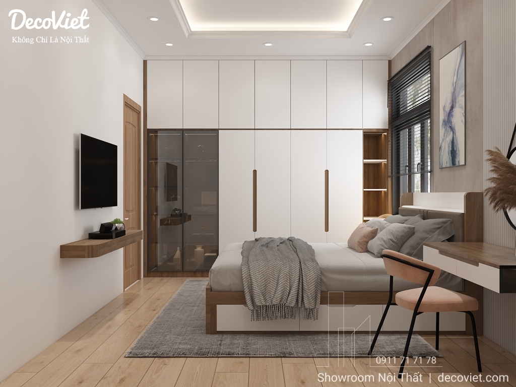 Thiết kế nội thất phòng ngủ hiện đại với phòng ngủ với đầy đủ nội thất như giường, tủ quần áo, bàn trang điểm, táp đầu giường,...