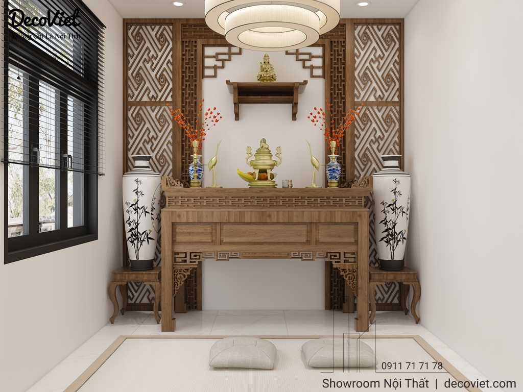 Thờ cúng ông bà tổ tiên thể hiện sự biết ơn và sự tưởng nhớ của con cháu đối với những người đã khuất. Phòng thờ gia tiên sử dụng chất liệu nội thất gỗ tự nhiên với các đường nét chạm trổ theo phong thuỷ mang đậm nét văn hoá truyền thống của người Việt.