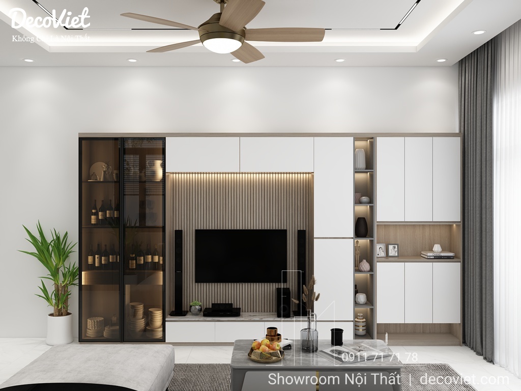 Mẫu phòng khách đẹp với kệ tivi gỗ công nghiệp cao cấp bao gồm: tủ trang trí, tủ lưu trữ, ốp vách sang trọng, kết hợp cùng hệ đèn led sang trọng. Tất cả tạo nên một tổng thể ấn tượng và cuốn hút.