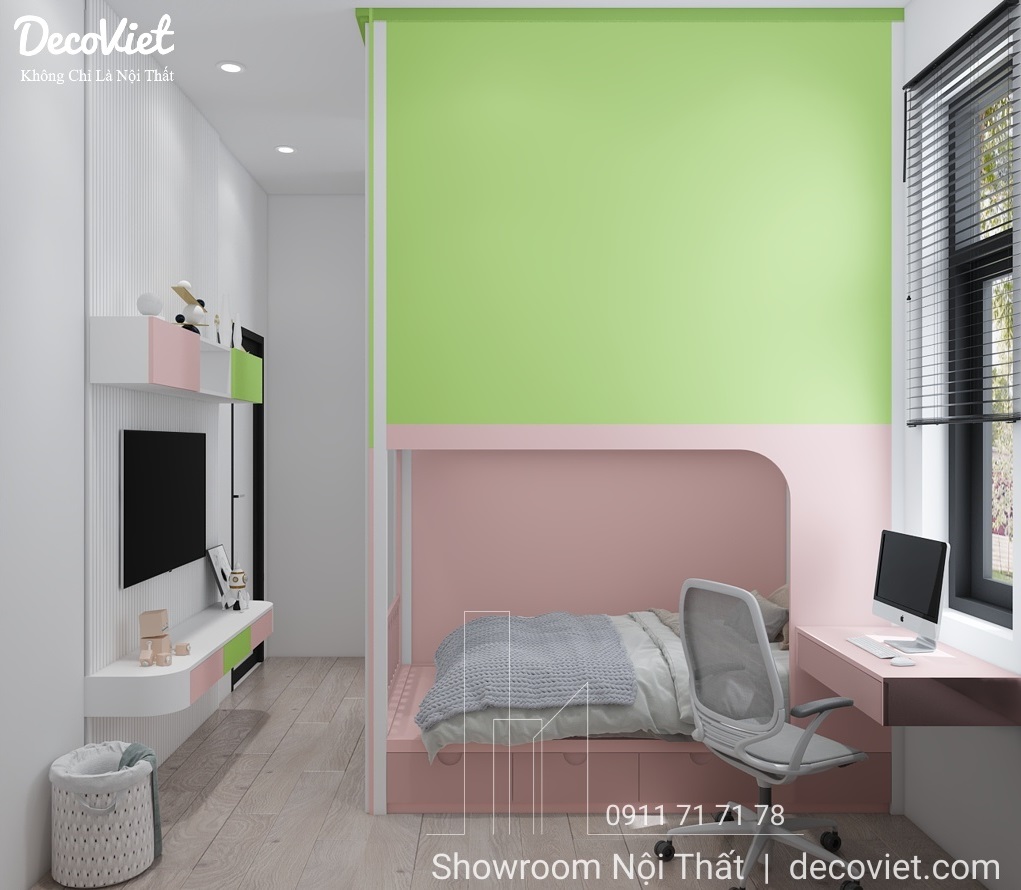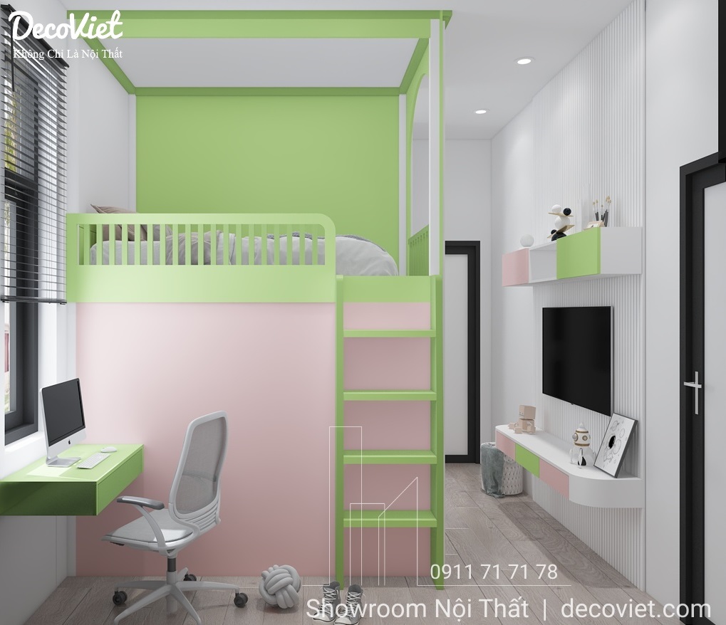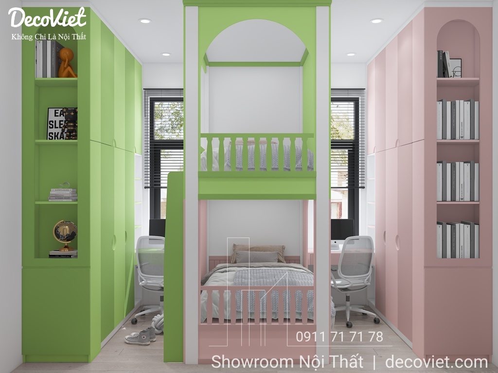 Căn hộ có diện tích không quá lớn nên việc thiết kế phòng ngủ đôi cho 2 bé là cần thiết để đảm bảo đủ nhu cầu sử dụng. Phòng ngủ đôi cho bé kiểu phòng được thiết kế dưới dạng tích hợp để cho 2 bé cùng vui chơi, học tập cùng nhau. Được phân biệt bằng 2 màu sắc sáng tạo, tích hợp 2 tính năng về phòng ngủ và không gian riêng tư.
