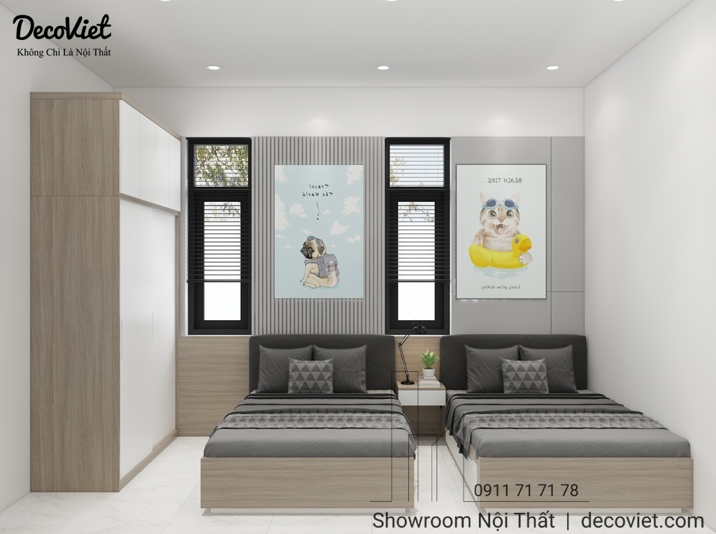 Việc đặt 2 giường trong phòng ngủ đòi hỏi việc thiết kế sao cho hợp lý và khéo léo để không gây cảm giác bí bách, chật chội. Thiết kế đáp ứng được đầy đủ công năng, vừa tạo độ thông thoáng cho căn phòng.