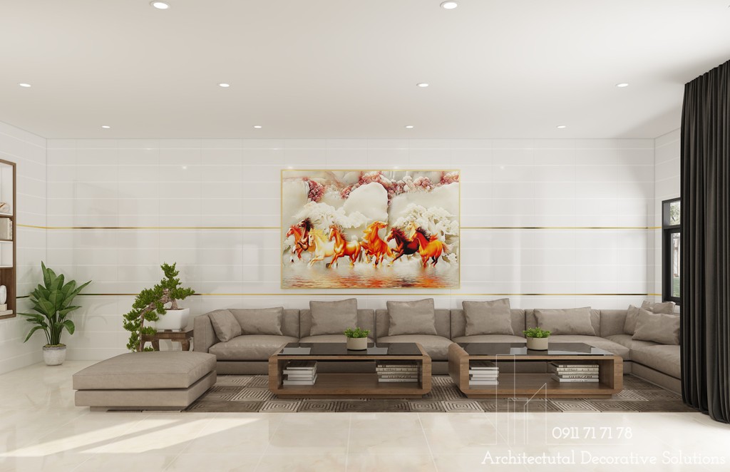 Bức tranh theo tường khổ lớn với họa tiết độc đáo là điểm nổi bật cho không gian phòng khách nhà phố.
